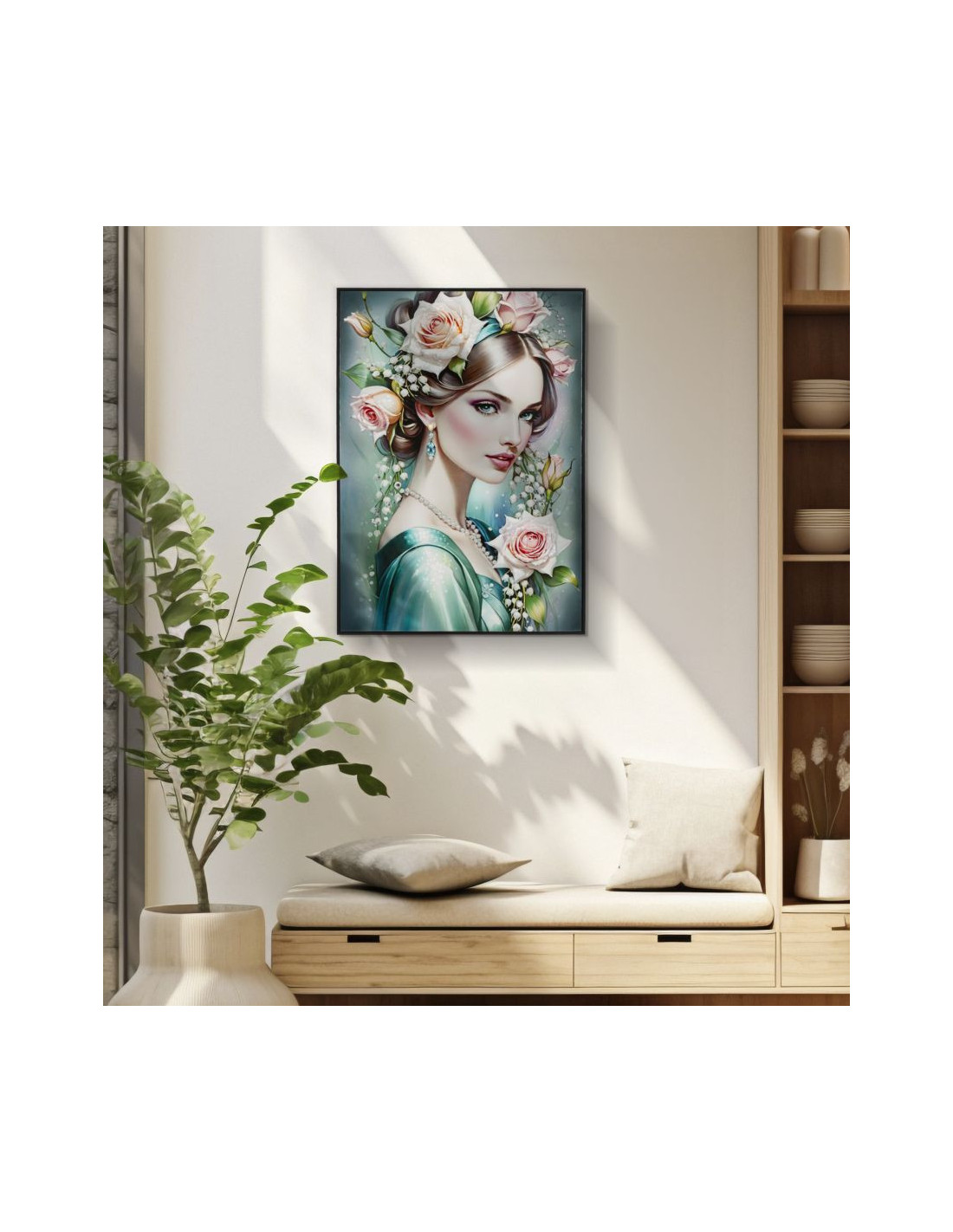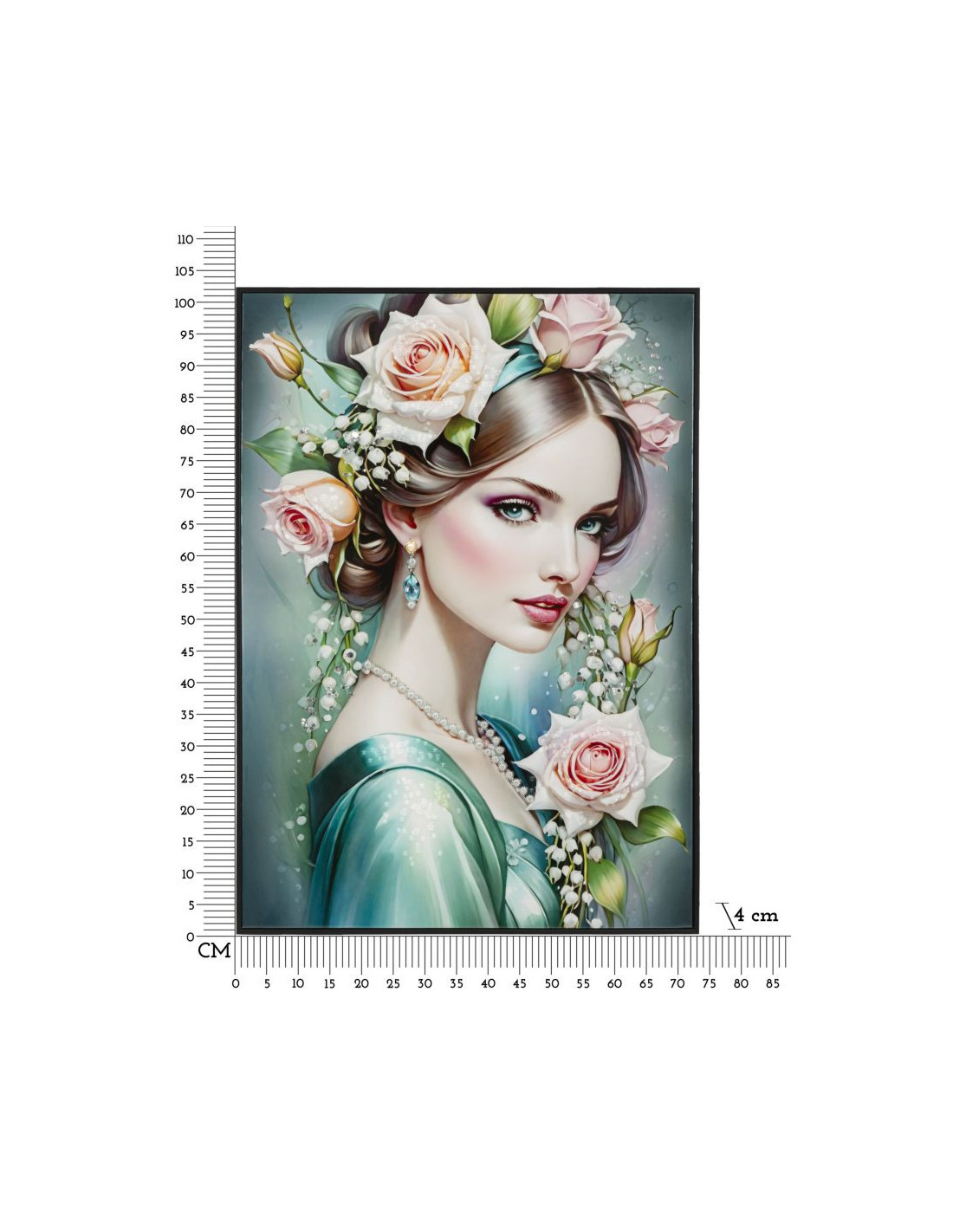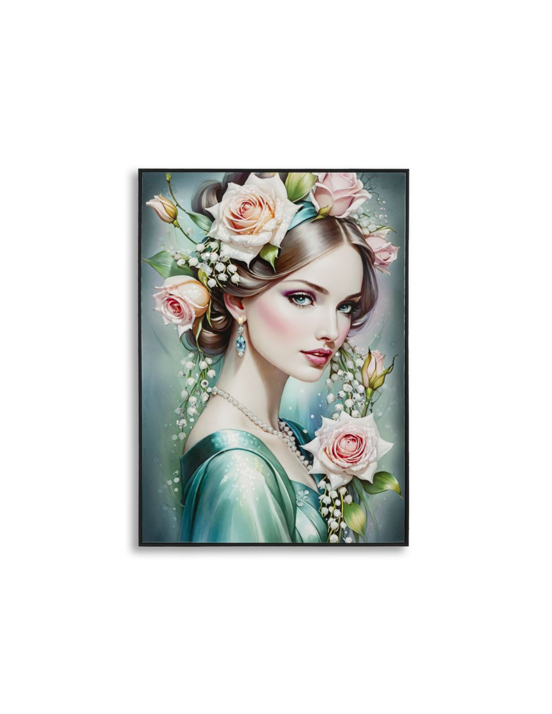 Grande toile murale peinte Femme fleurs robe turquoise 72x102 avec cadre noir Fantasy
