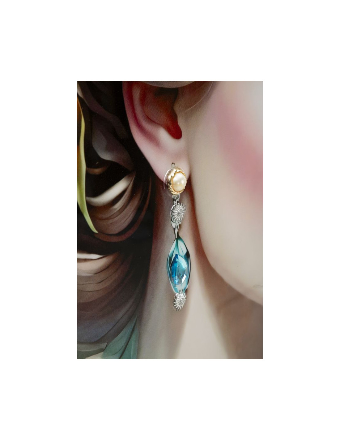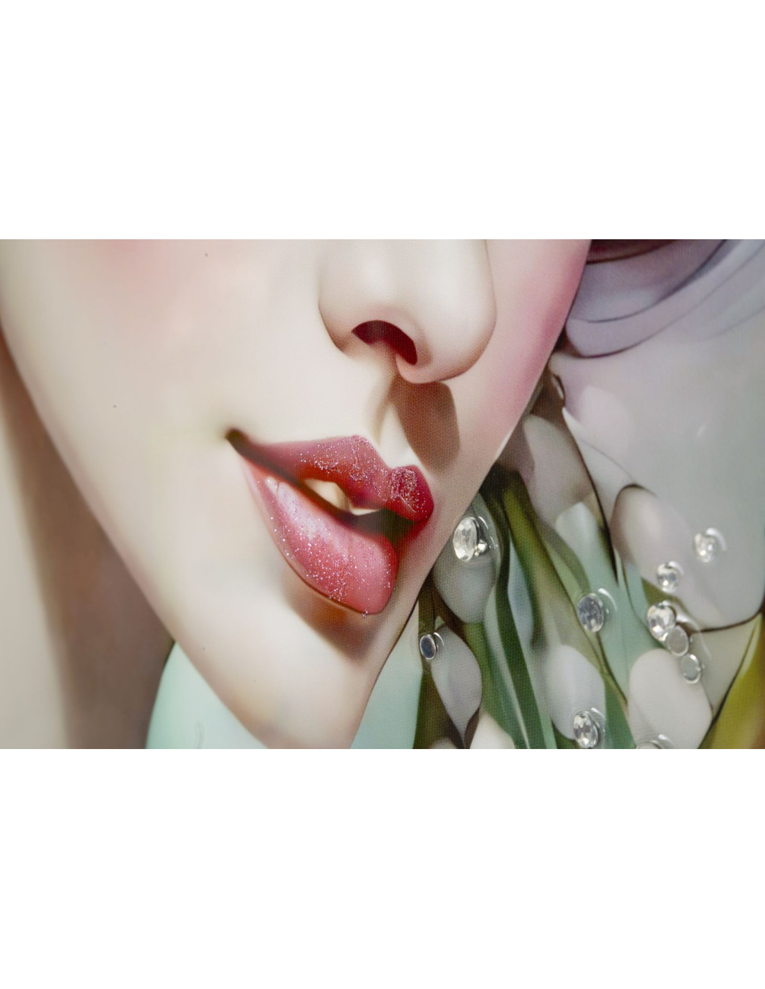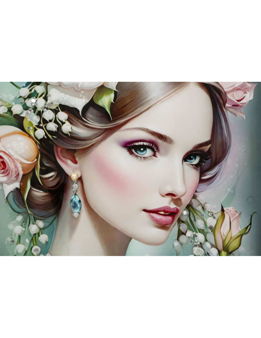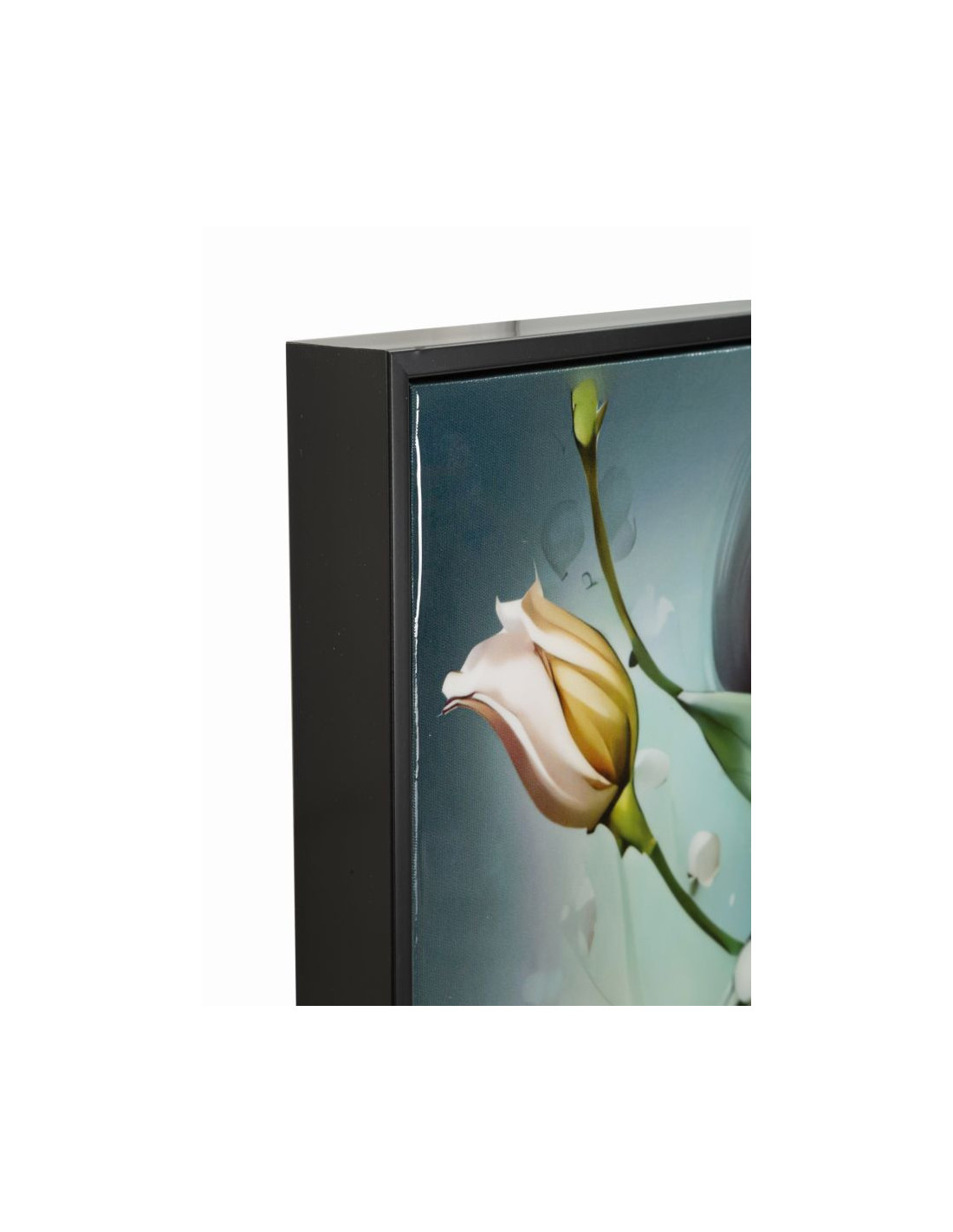 Grande toile murale peinte Femme fleurs robe turquoise 72x102 avec cadre noir Fantasy