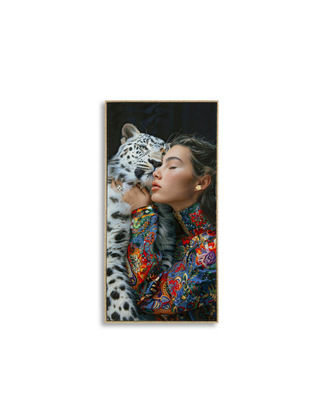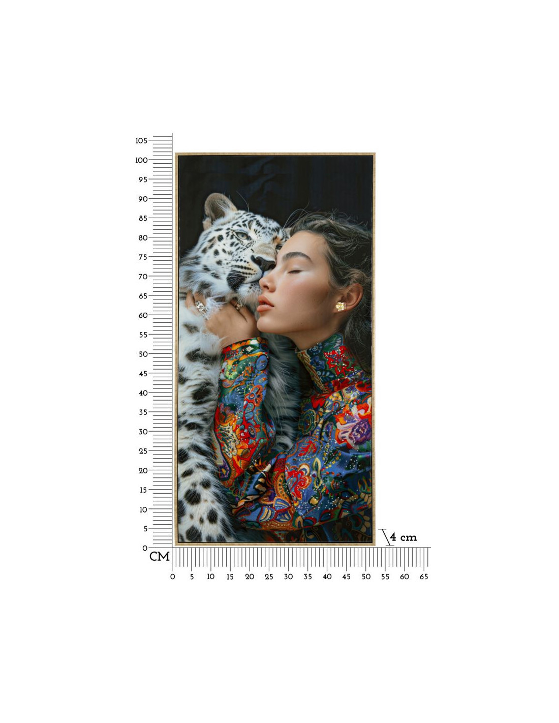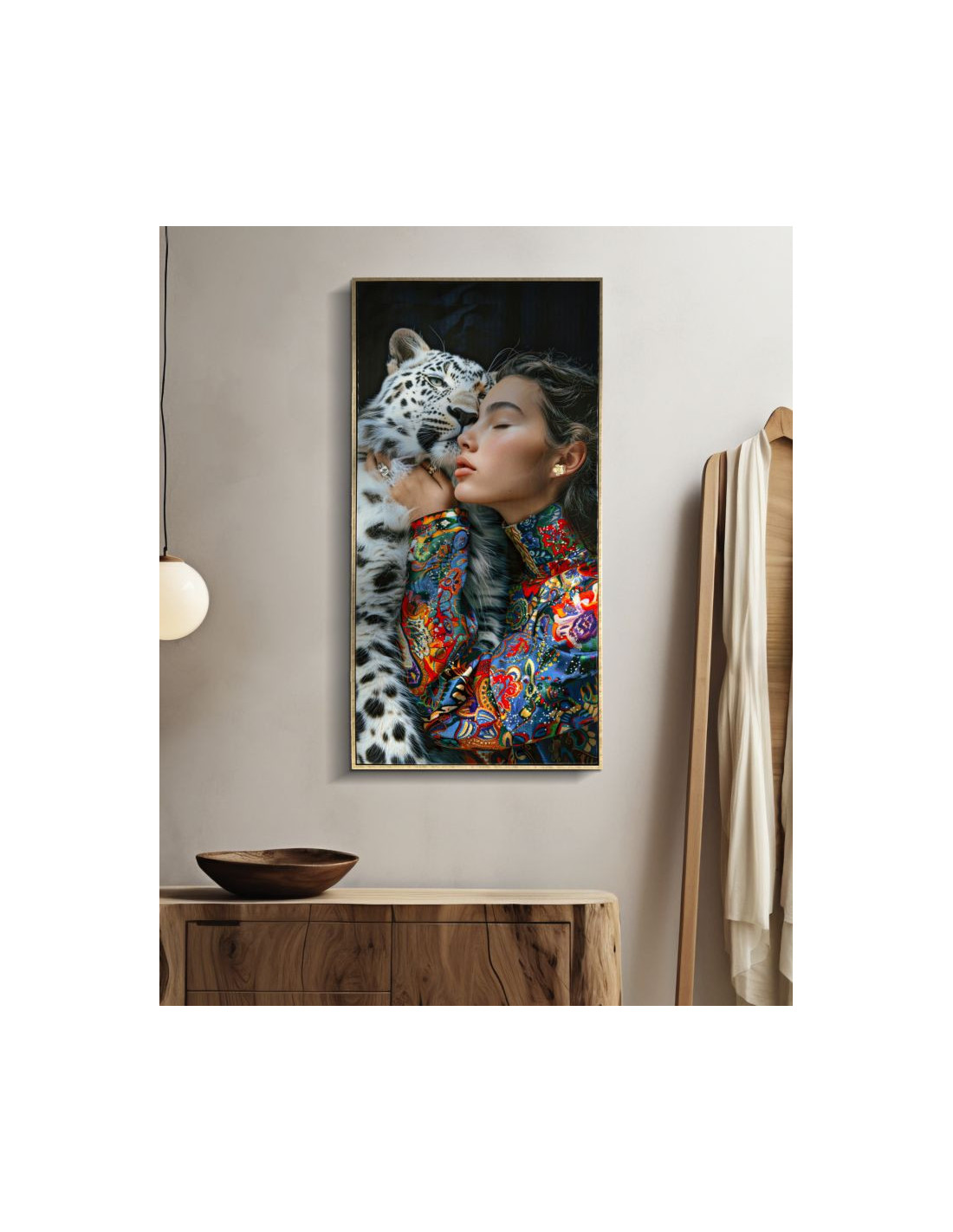 Grande Toile murale peinte Femme Léopard des neiges 52x102 avec cadre doré Moira