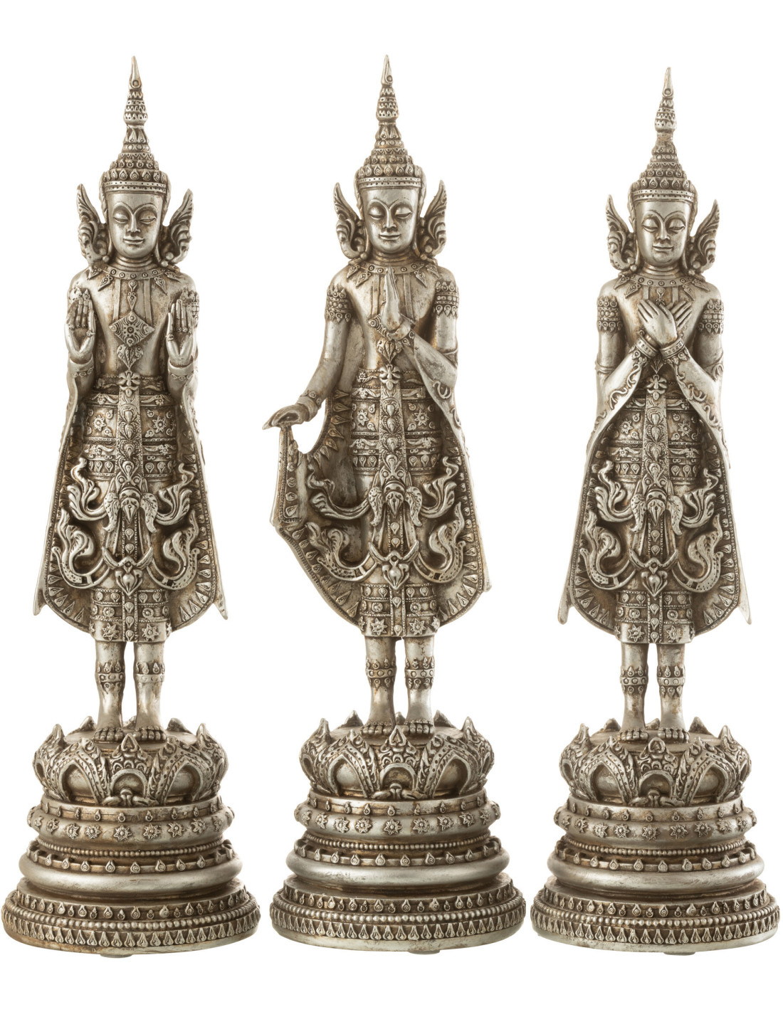 Grandes Statuettes orientales Bouddhas debouts Hauteur 43 cm en Résine Argenté Sinara (Lot de 3)