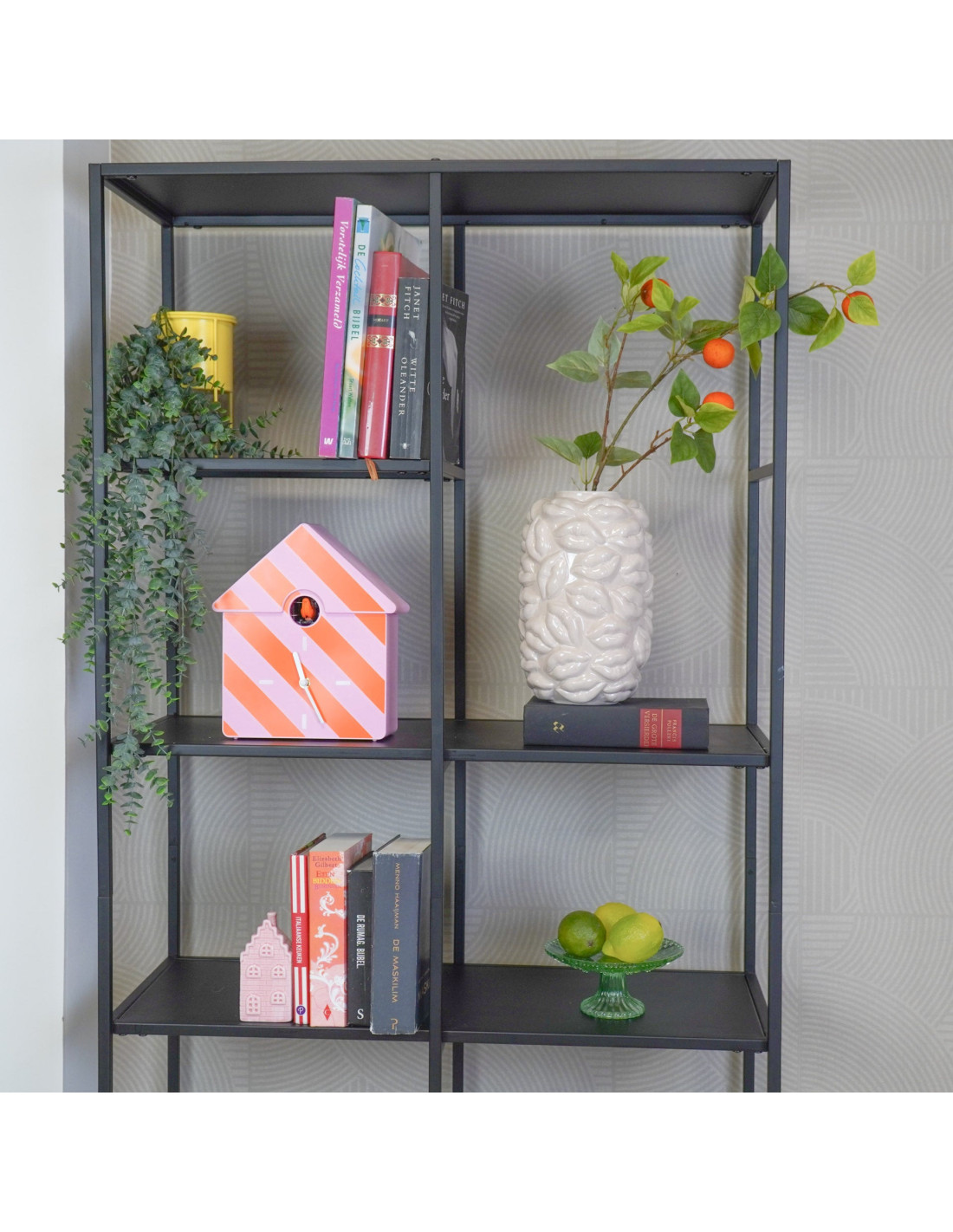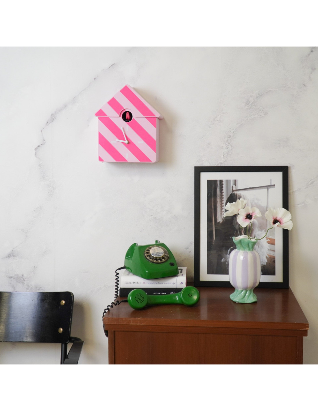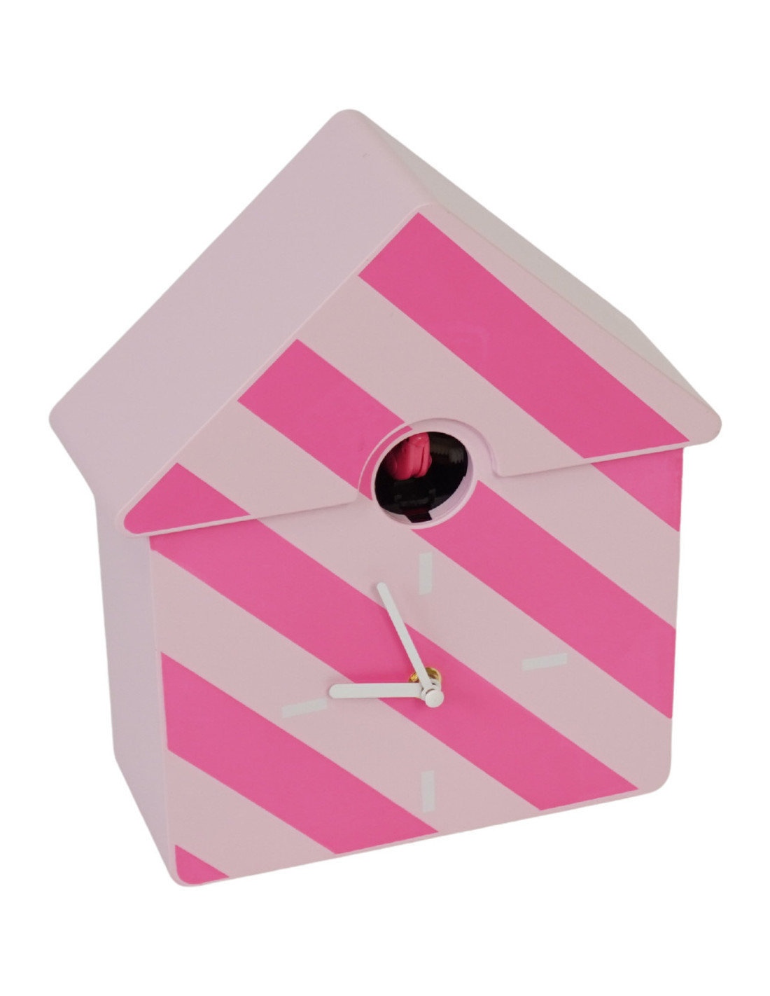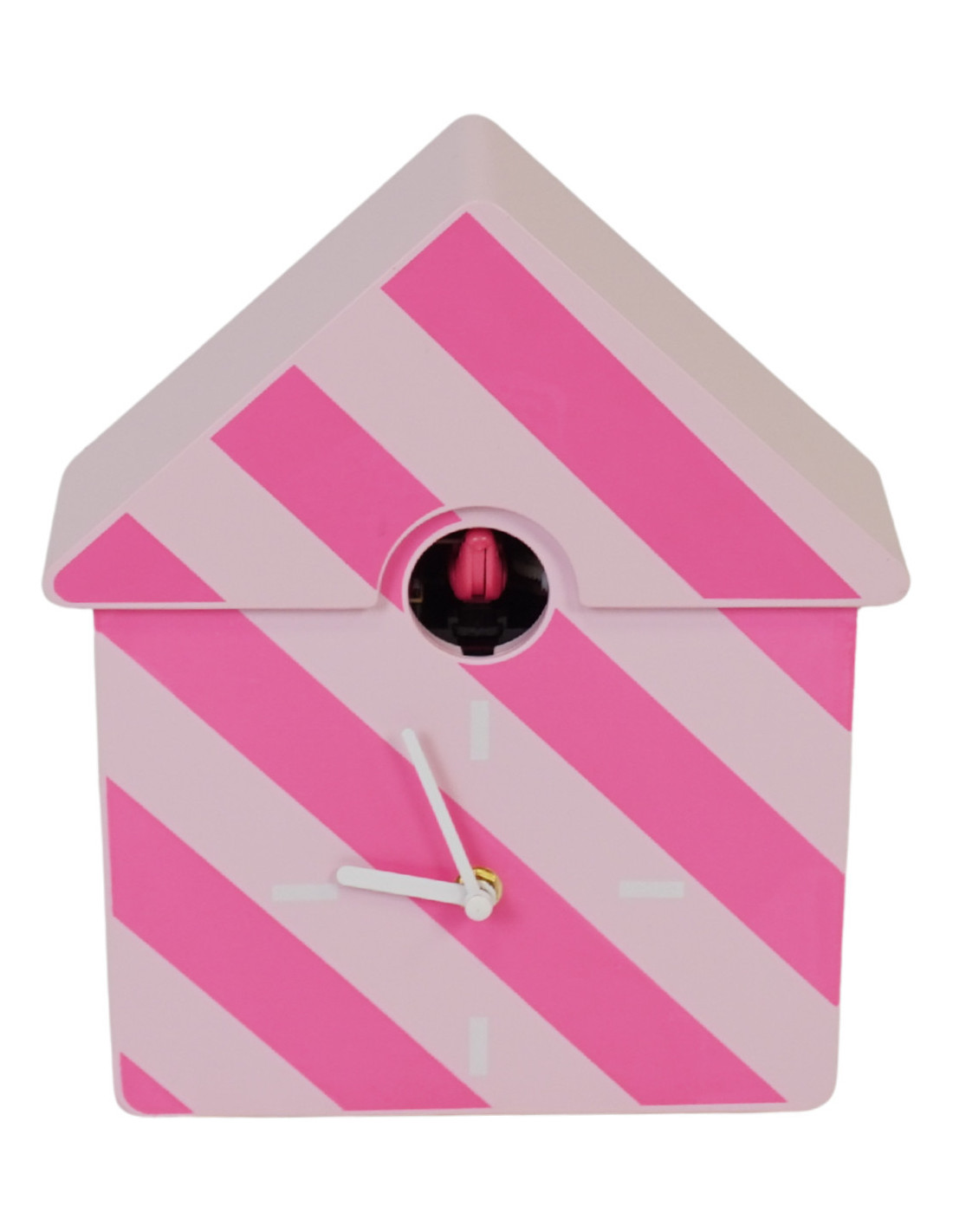 Horloge murale moderne Coucou Nichoir Hauteur 27 cm Plastique Rose clair Rose fluo Motif rayures Cucko