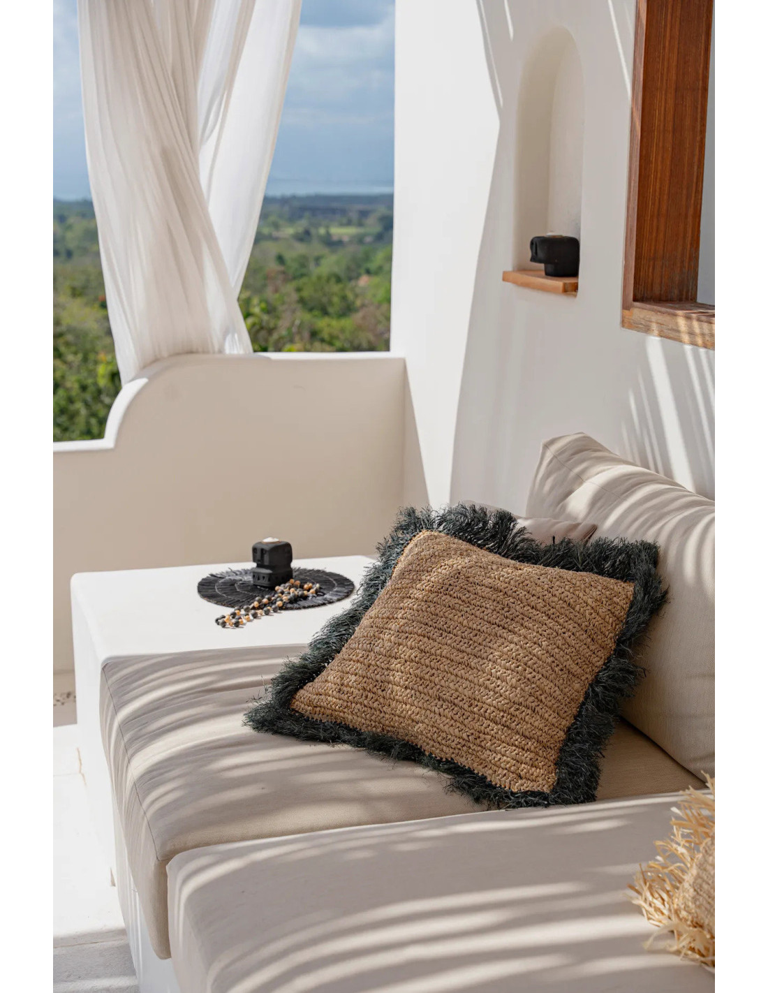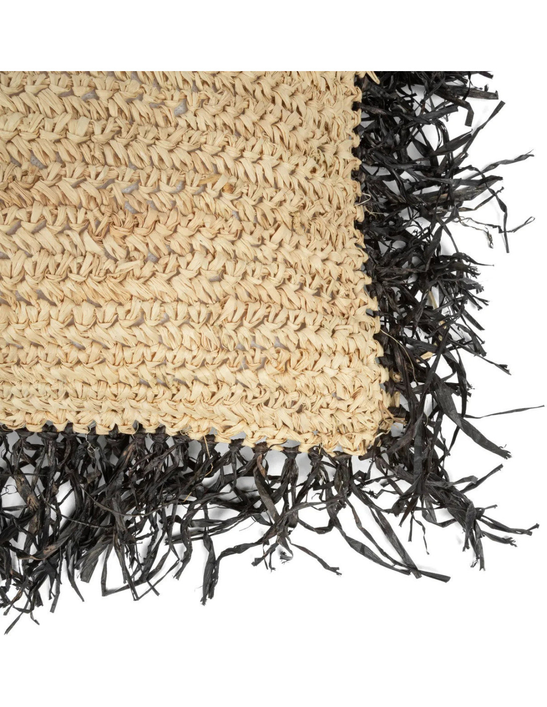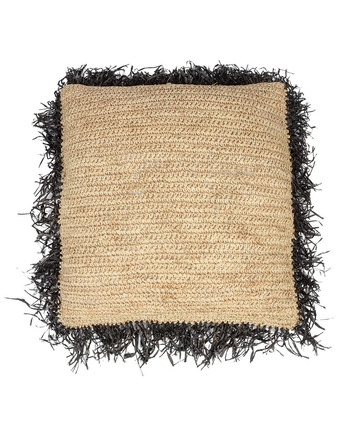 Housse de coussin XL Carrée 60x60 en Raphia Naturel Noir avec franges The Raffia Square