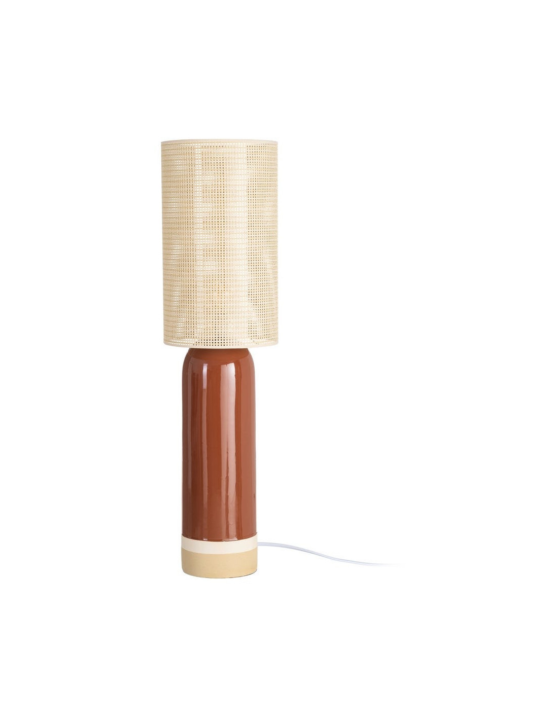 Pied en céramique finition terracotta. Abat-jour en tissu et PVC avec aspect tissé. Fonctionne avec une ampoule E27 (non fournie).