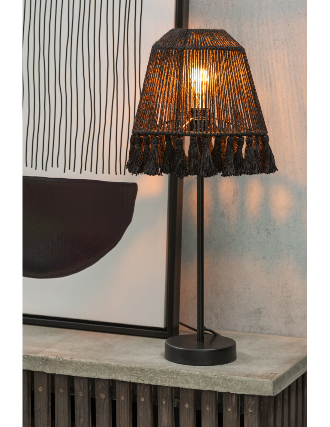 Lampe à poser Mila en Jute Noir Bois de manguier Naturel Avec pompons - 1