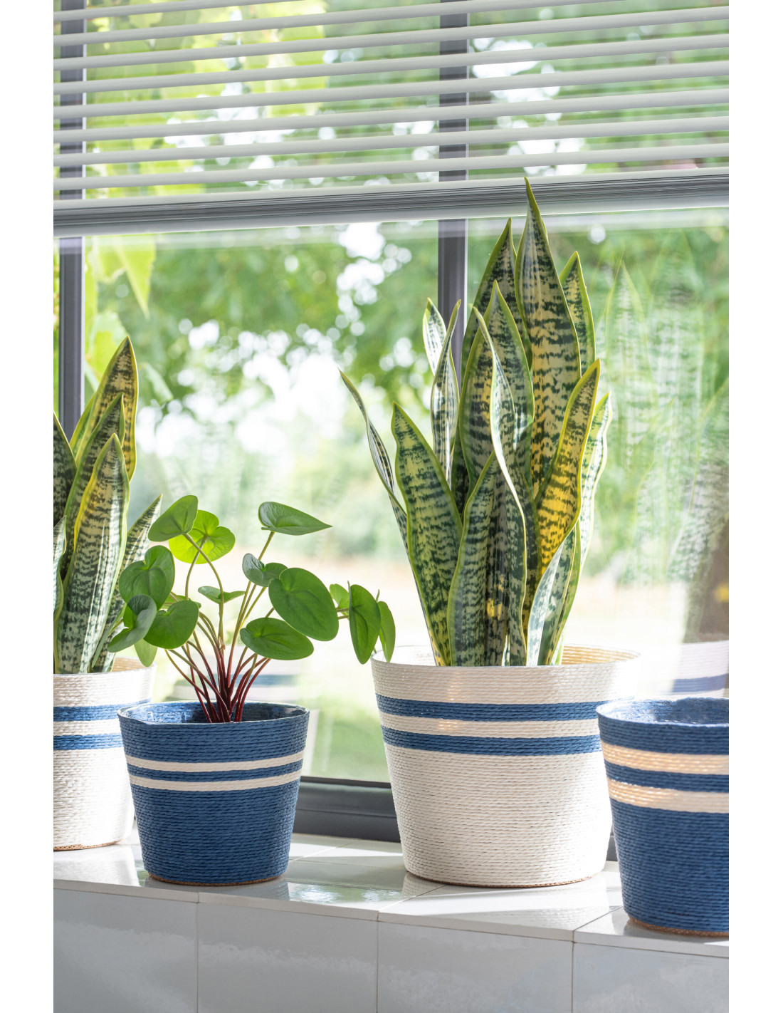 Lot de 2 Cache-pots modernes D 17 cm Papier Bleu foncé Blanc Tressé Motif lignes Dorinel