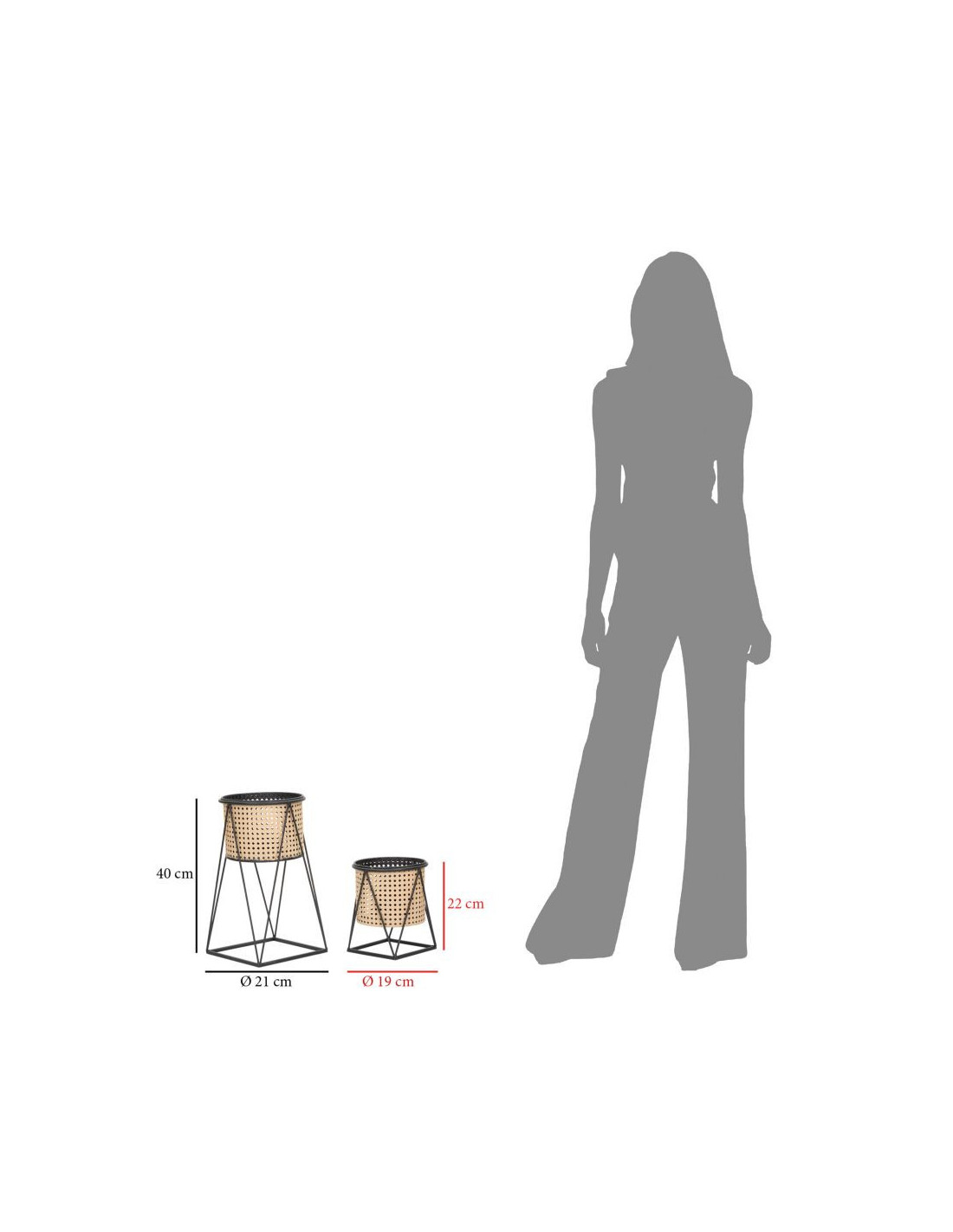 Lot de 2 Grands Cache-pots Bohème chic Rond Métal Naturel Effet cannage Noir Osaka