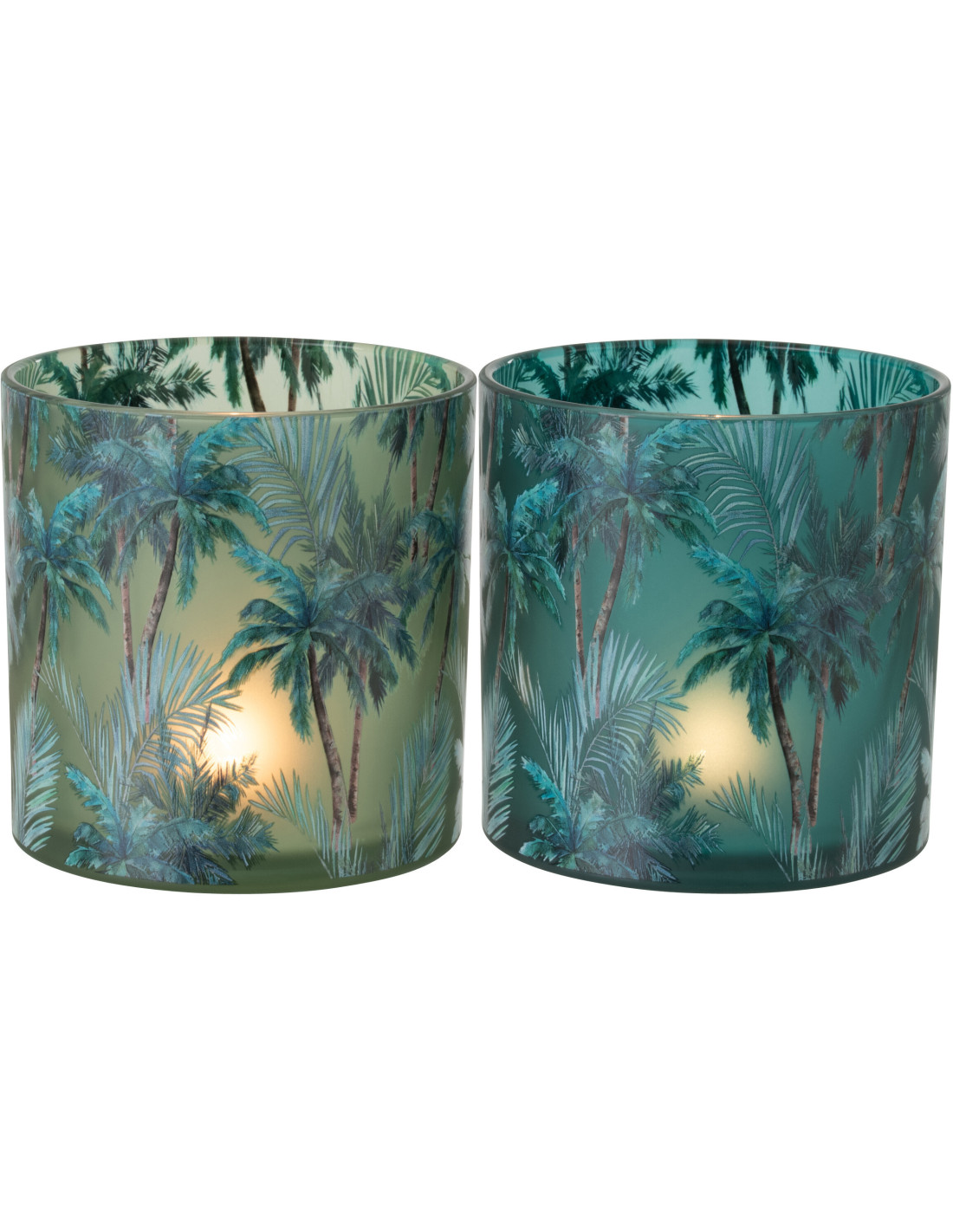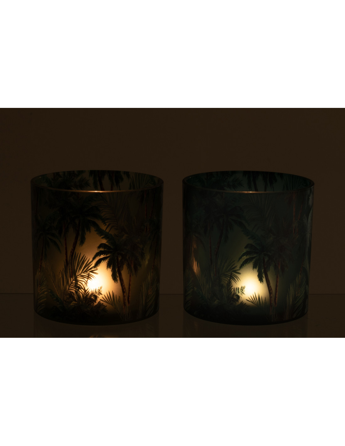 Lot de 2 Grands Photophores style jungle Verre Vert Motif tropical Palmora