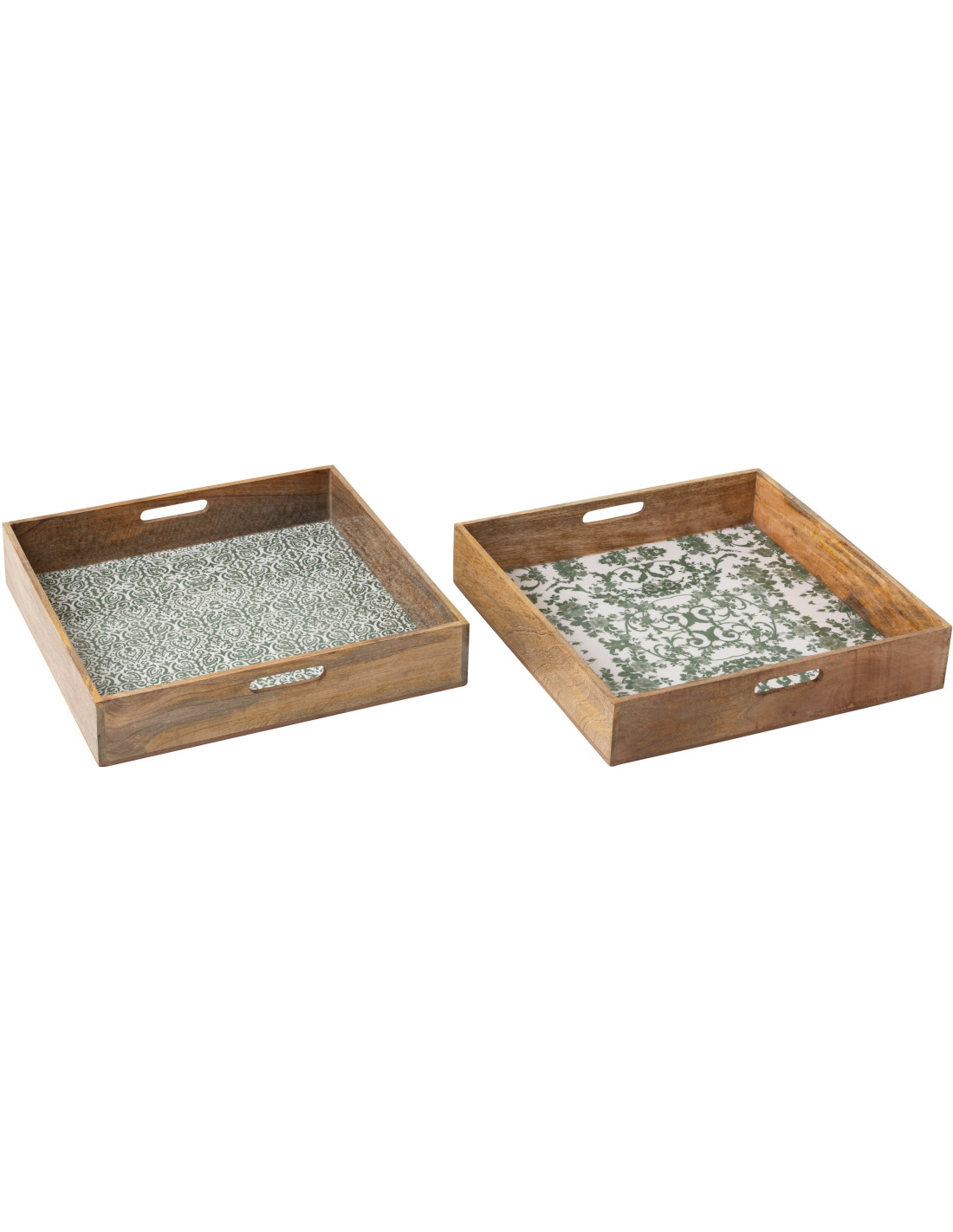 Lot de 2 Grands Plateaux Campagne chic Carré 50 cm Bois de manguier Vert Blanc Naturel Verdeno