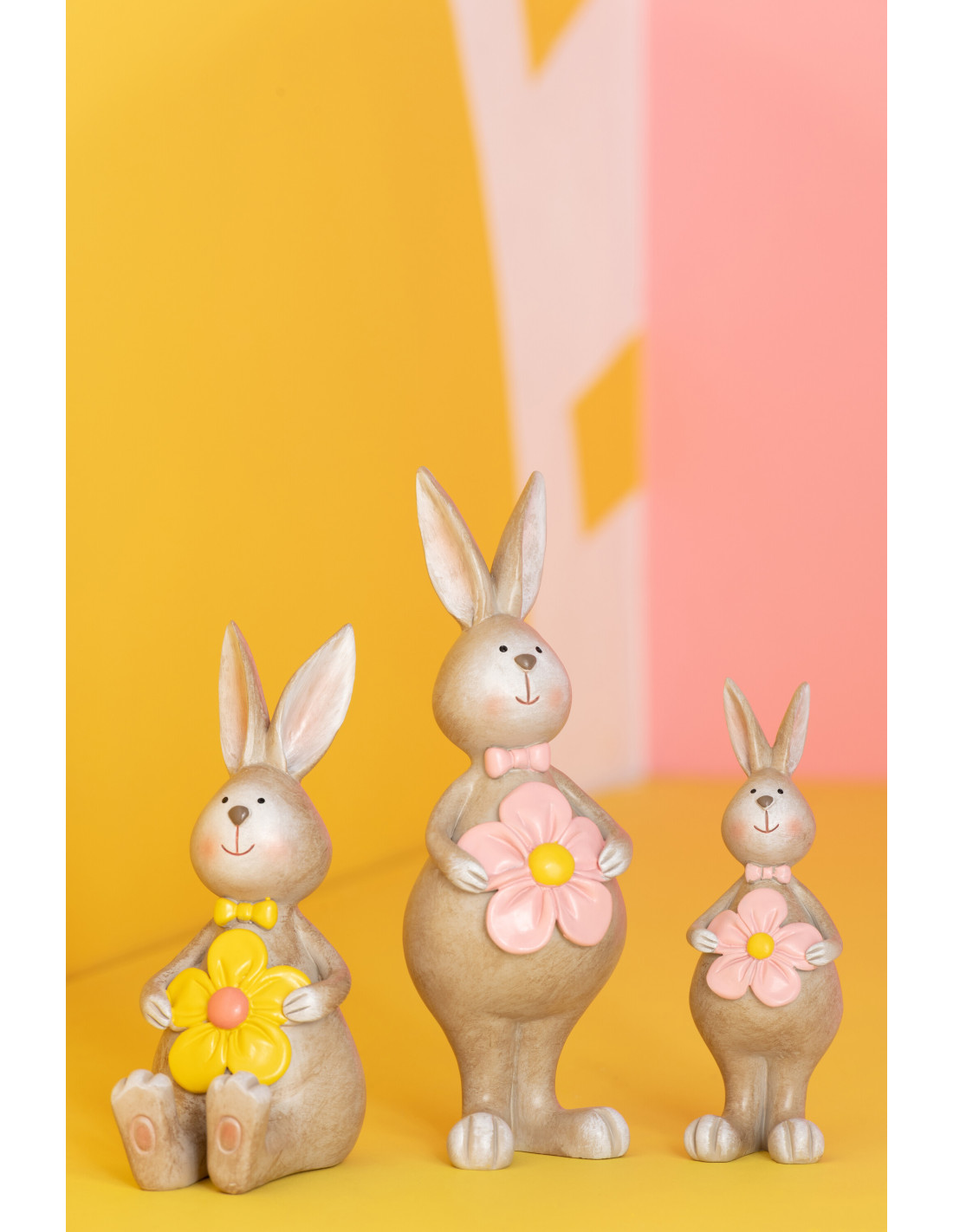 Chaque figurine possède sa propre nuance florale. L’une joue avec un jaune lumineux, l’autre avec un rose plus doux. Ensemble, elles créent une composition harmonieuse.