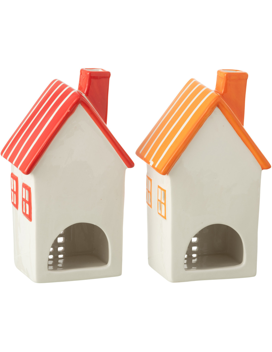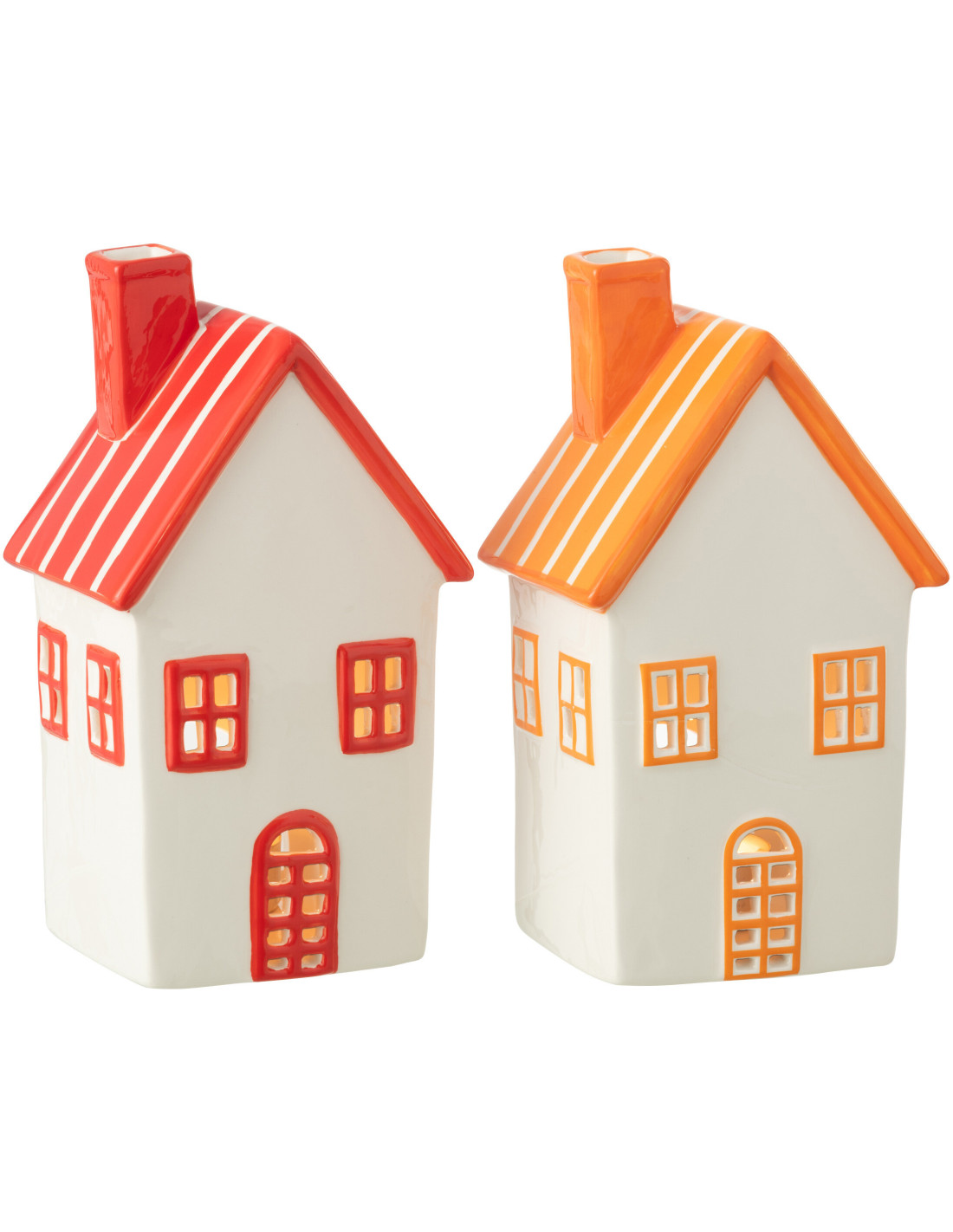 Lot de 2 Photophores design Maisons H 21 cm Dolomite Rouge Orange Blanc Motif rayures Casitia