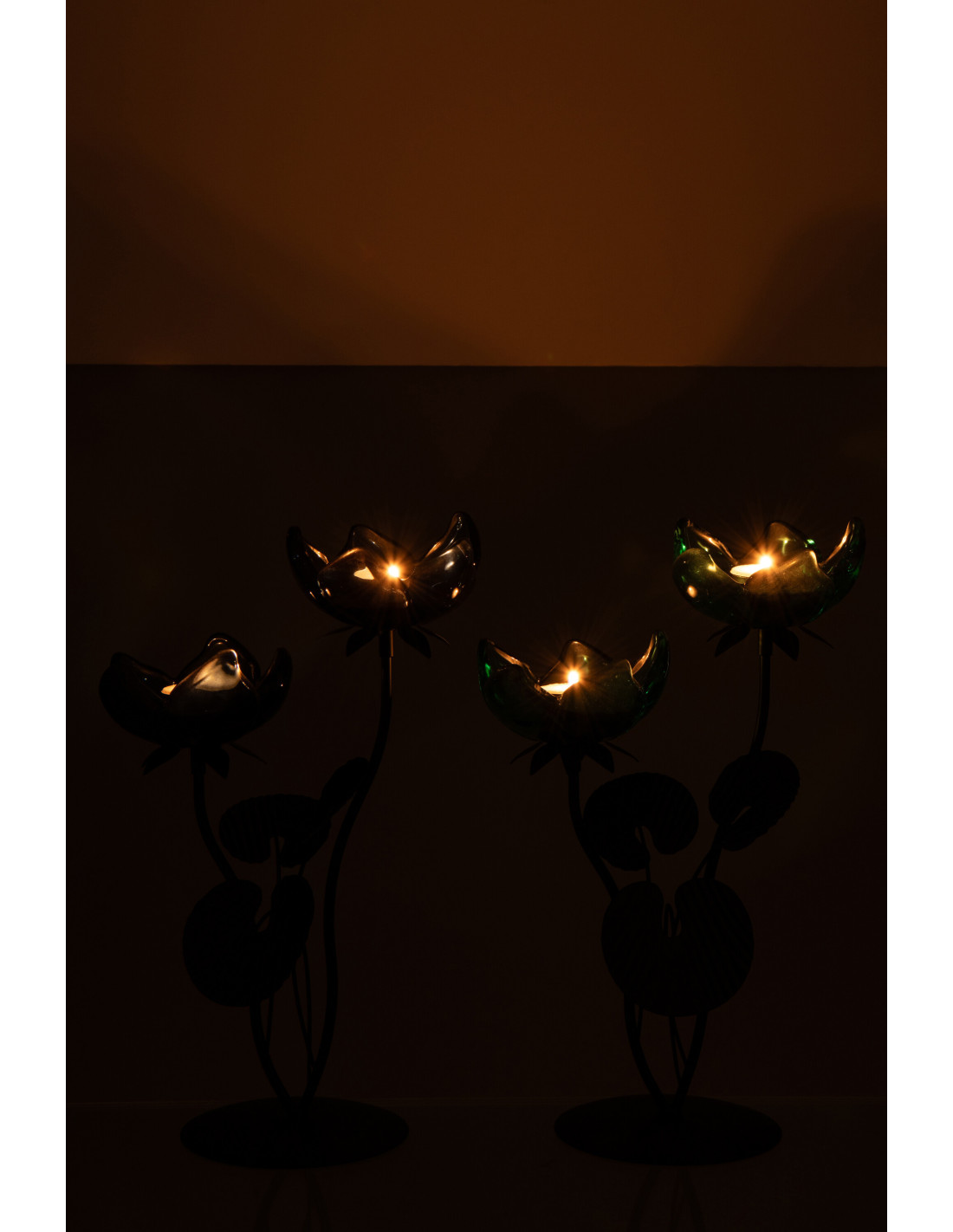 Lot de 2 Photophores sur pied 2 Bougies Fleurs H 33 cm Verre Bleu Vert Métal Noir Florynia
