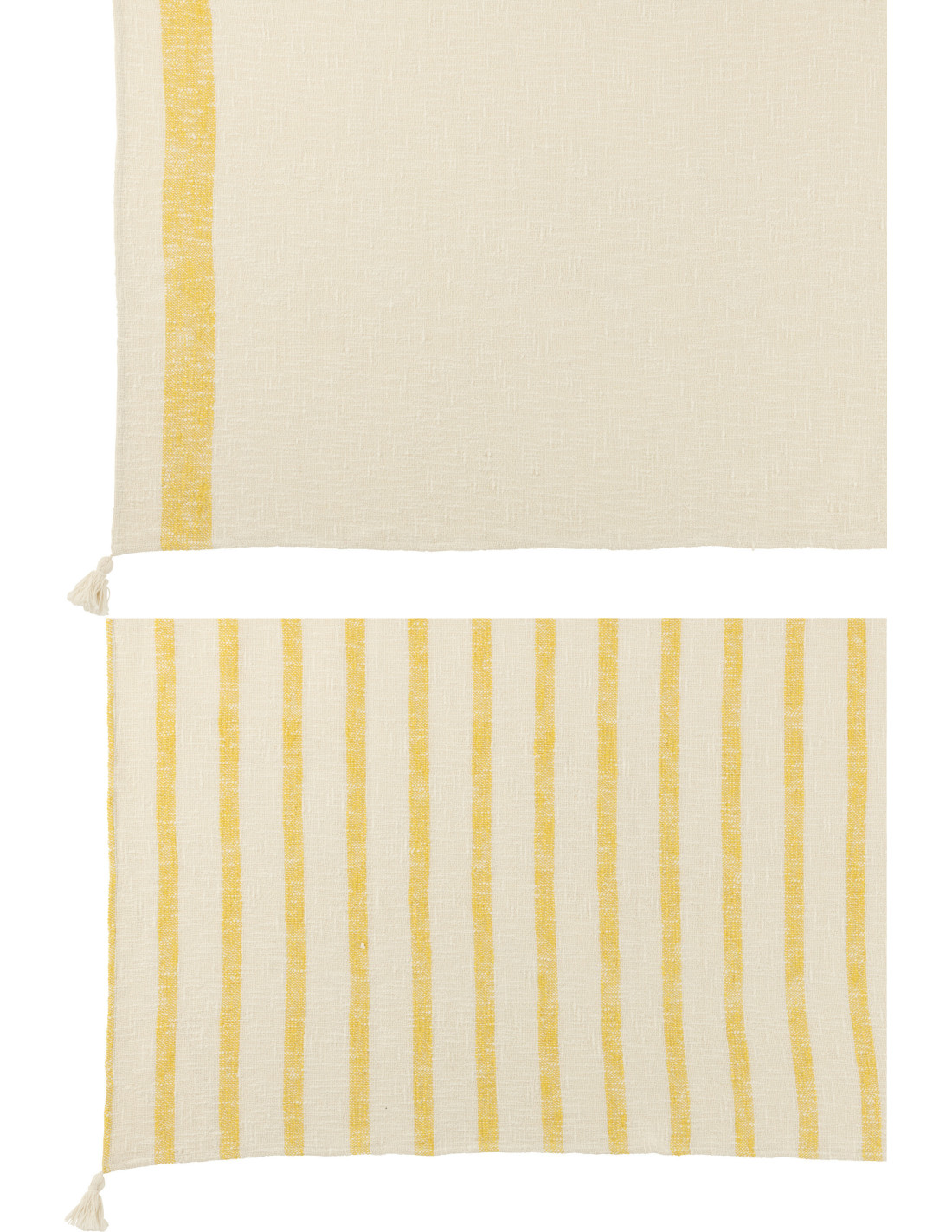 Ces deux plaids apportent une sensation immédiate de confort visuel. Leurs lignes jaunes viennent dynamiser une base écru, créant un équilibre parfait entre douceur et caractère.