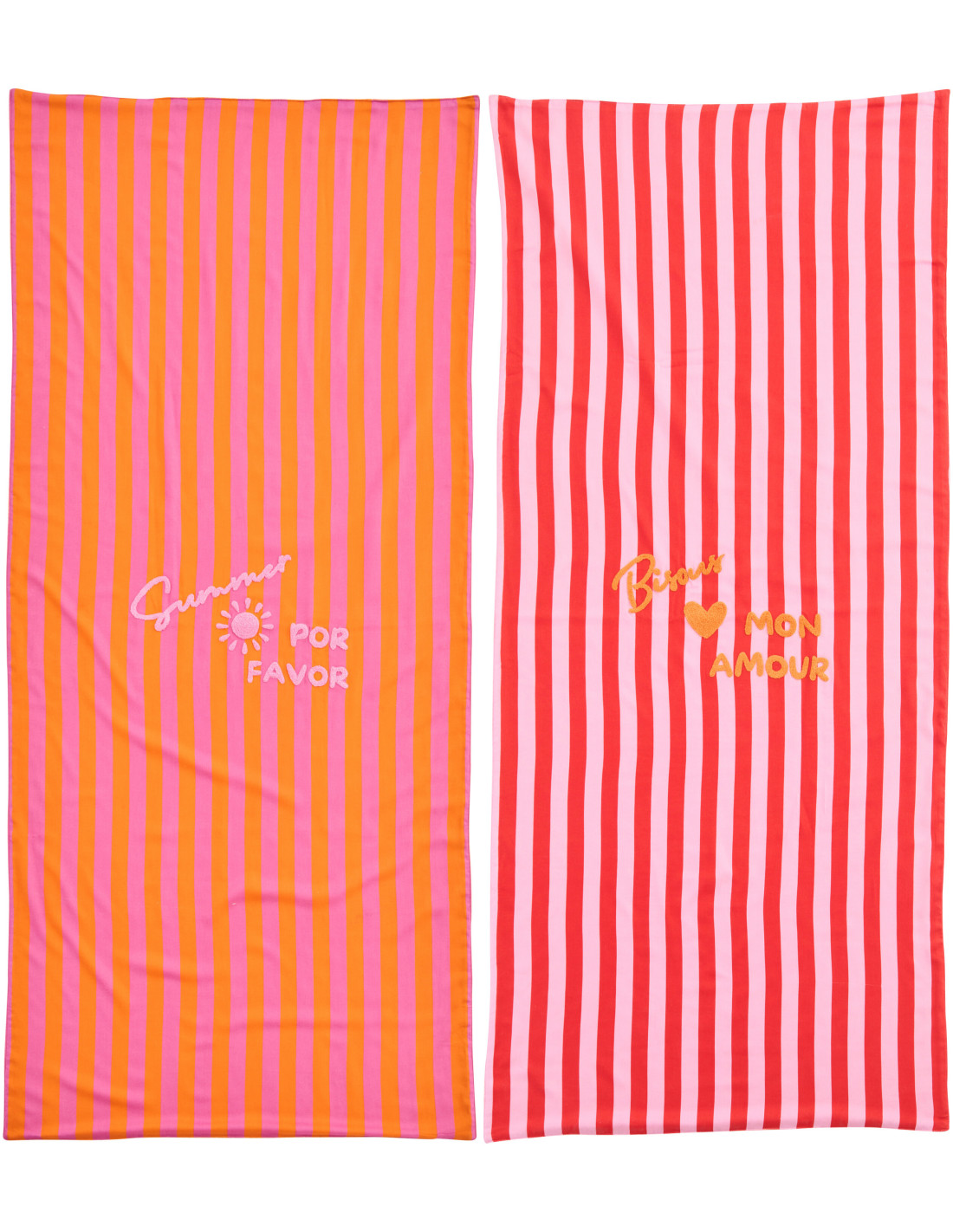 Lot de 2 Serviettes de plage style riviera italienne 80x180 Coton Rose Orange Rouge Motif rayures La Spiaggia