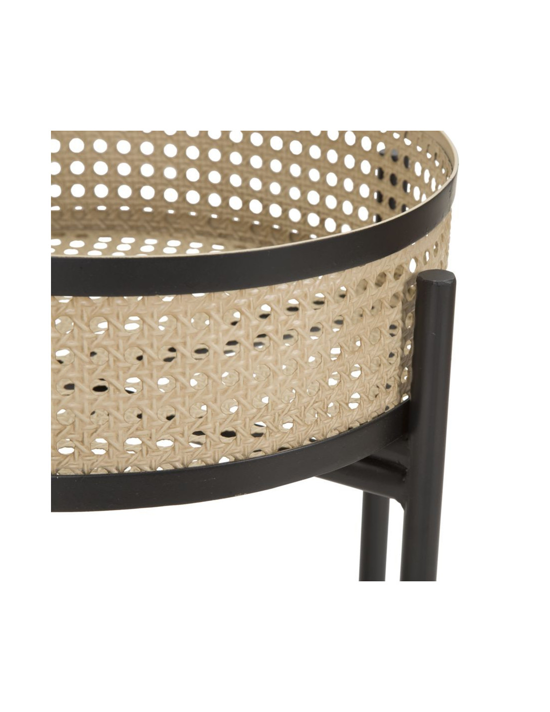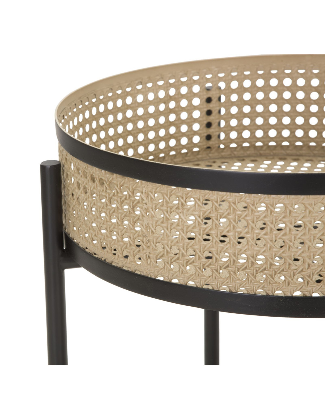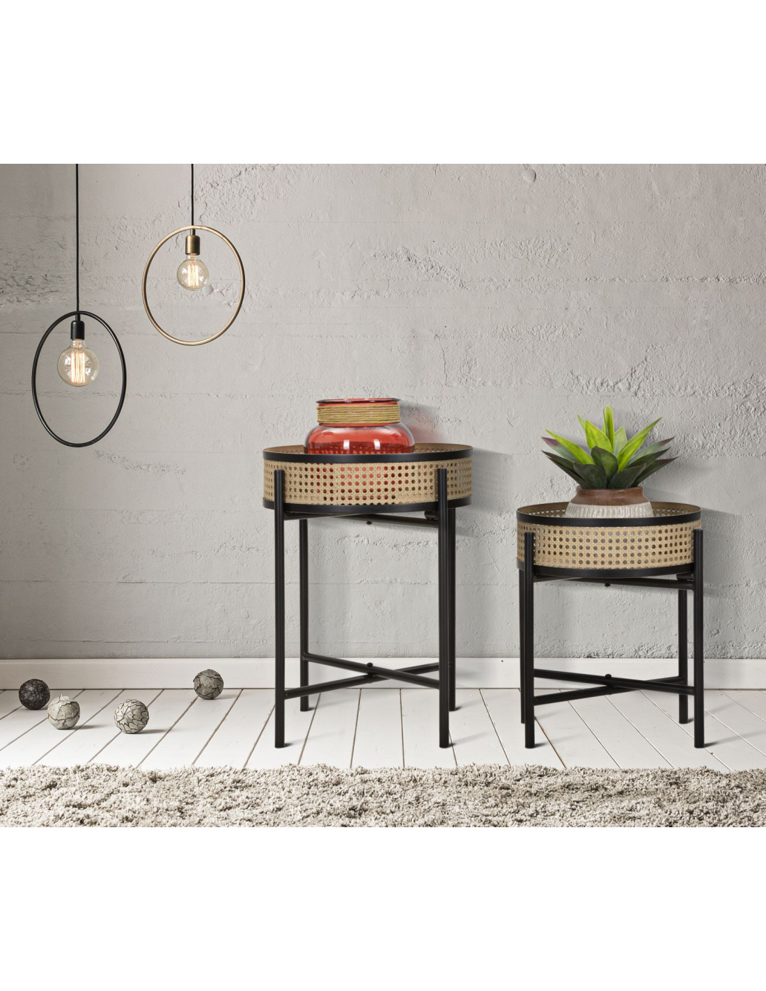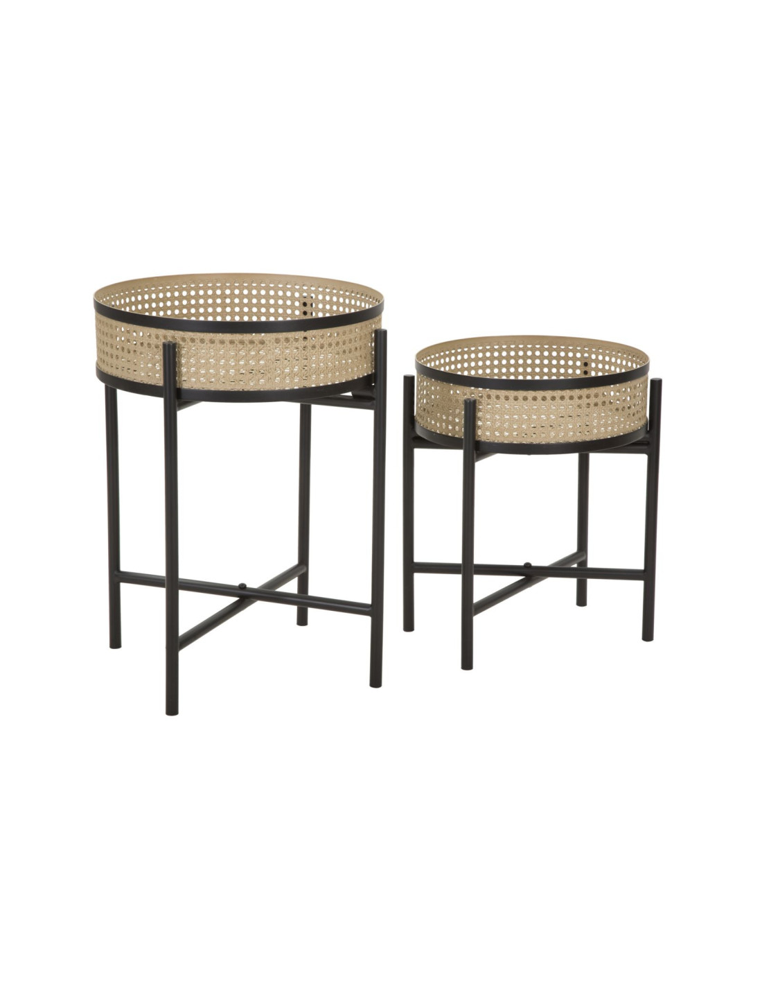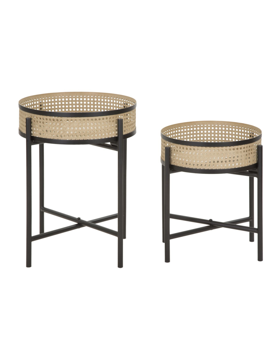 Lot de 2 Tables d'appoint design bohème chic Ronde Métal Naturel Effet cannage Noir Fuji