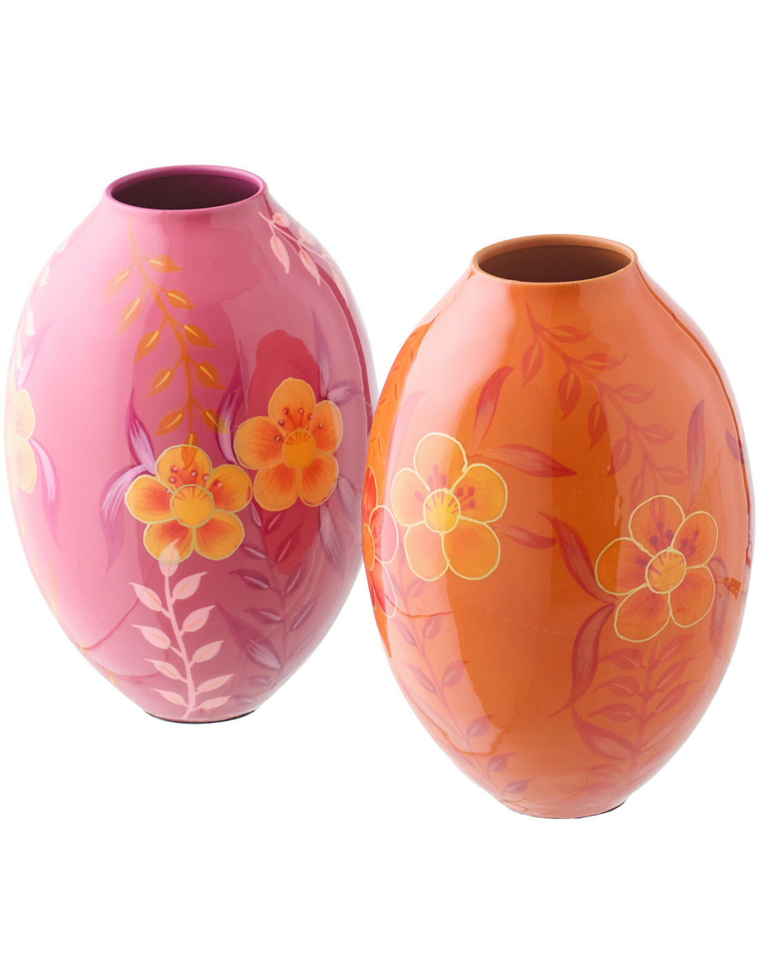 Lot de 2 Vases style seventies néo-folk Ovale H 24 cm Métal Orange Rose Laqué Motif fleurs Florezina