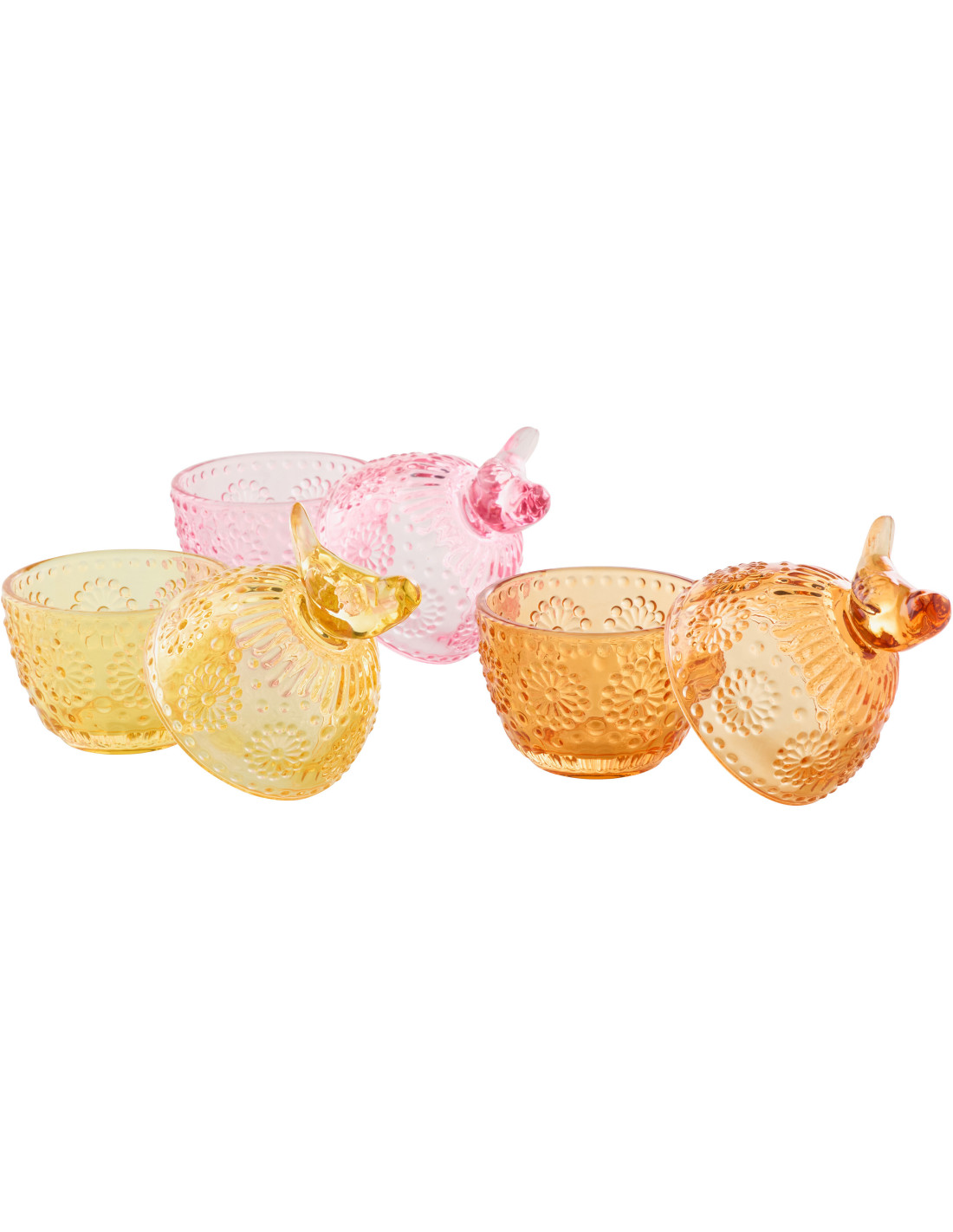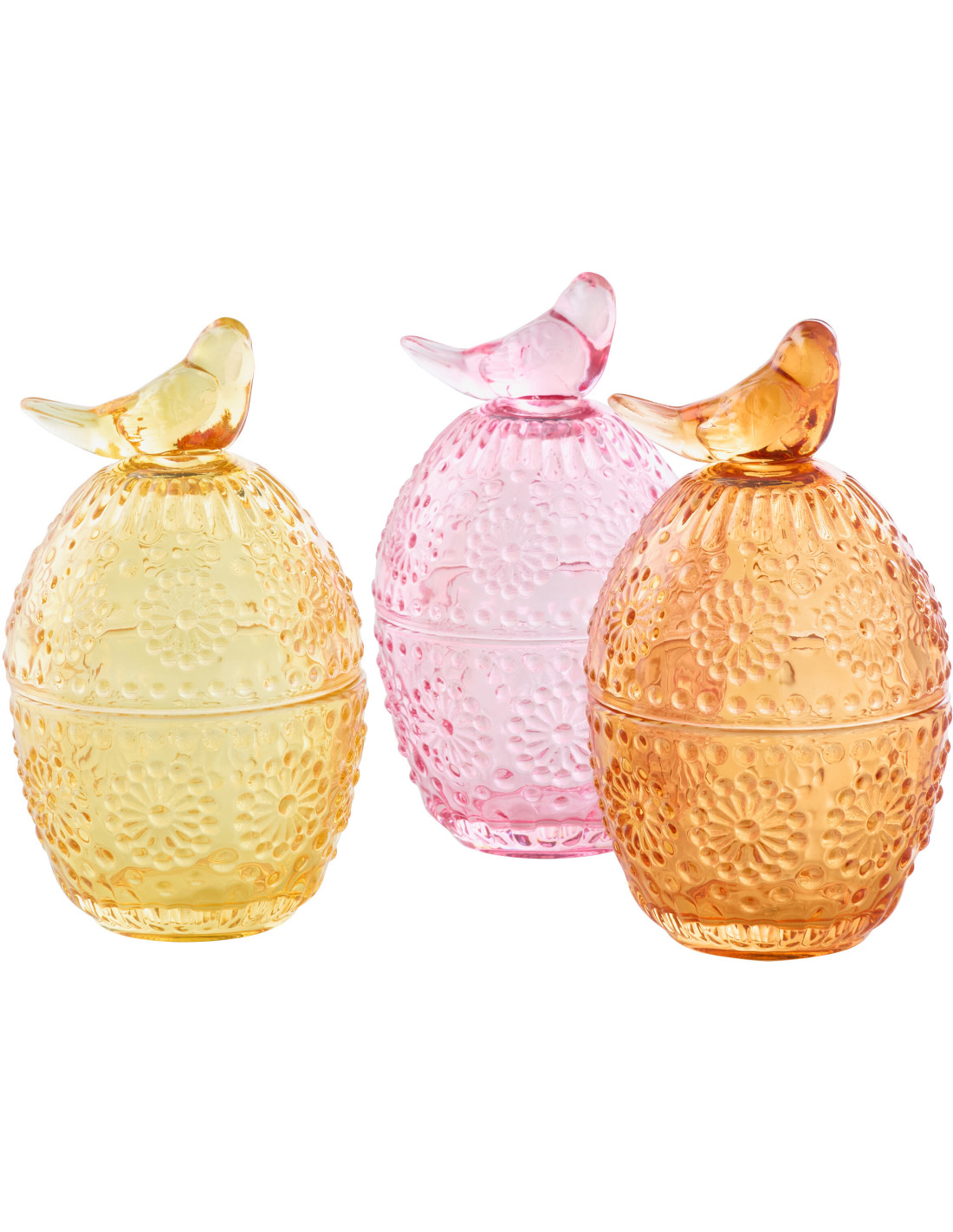 Lot de 3 Boîtes déco Oiseau avec couvercle Oeuf Verre Jaune Rose Orange Luminadia