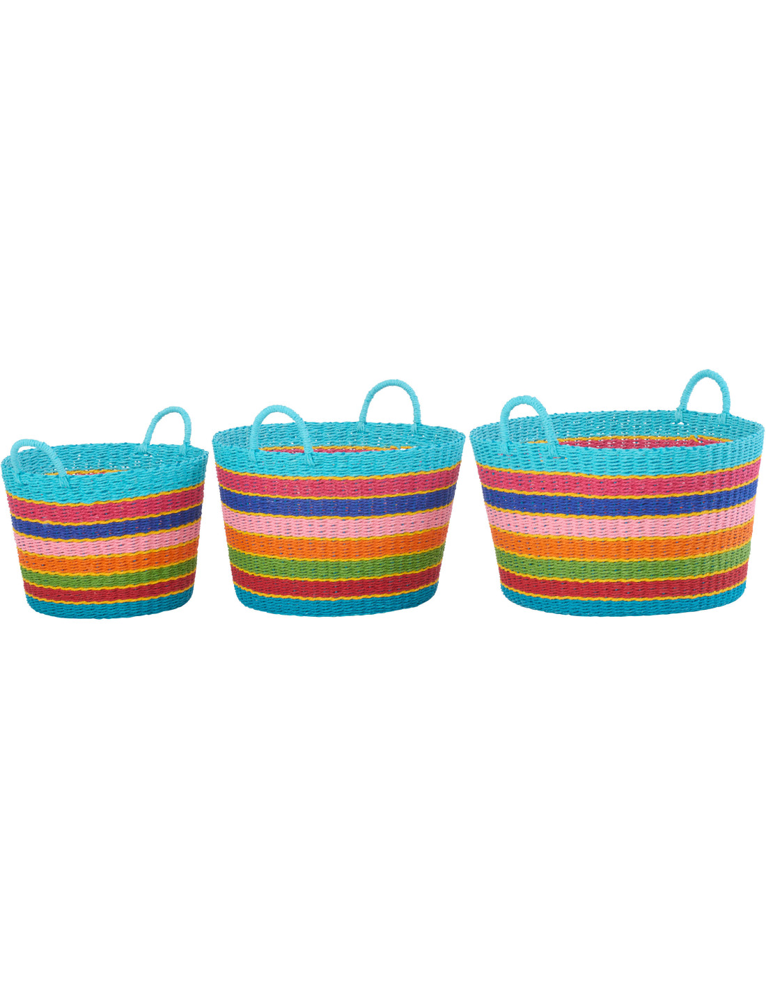 Lot de 3 Paniers de rangement africains avec anses Papier Multicolore Tressé Motif lignes Bambara
