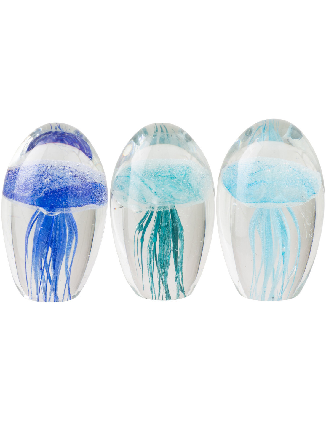 Un trio de méduses en verre aux nuances marines, entre transparence et profondeur colorée.