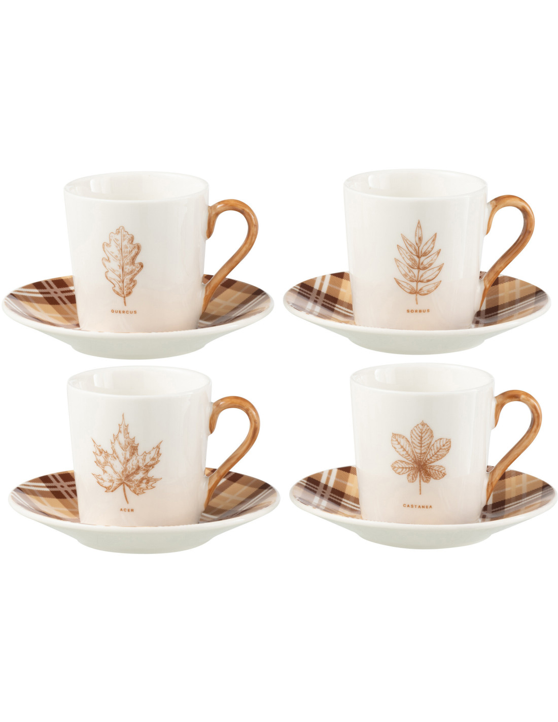 Lot de 4 Tasses à café campagne chic 80 ml Céramique Blanc Marron Motif feuilles Leavina