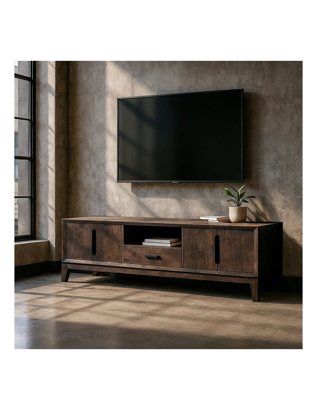 Grand Meuble télé moderne 4 portes 1 tiroir 1 niche en Bois de manguier Marron Kilian