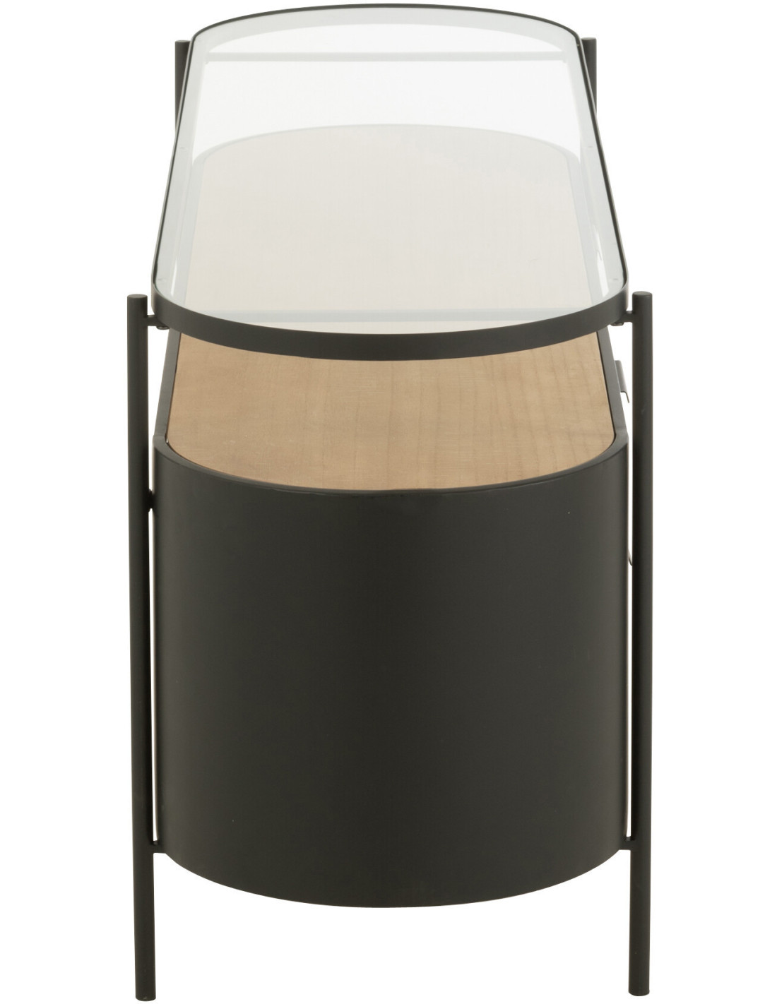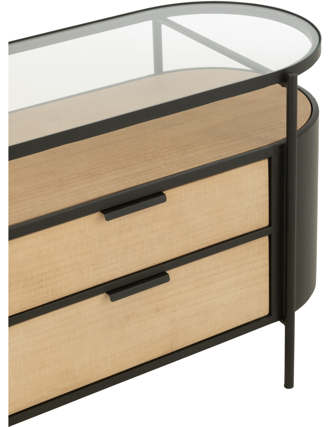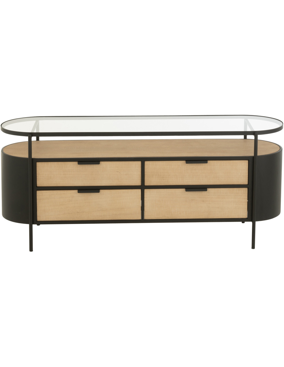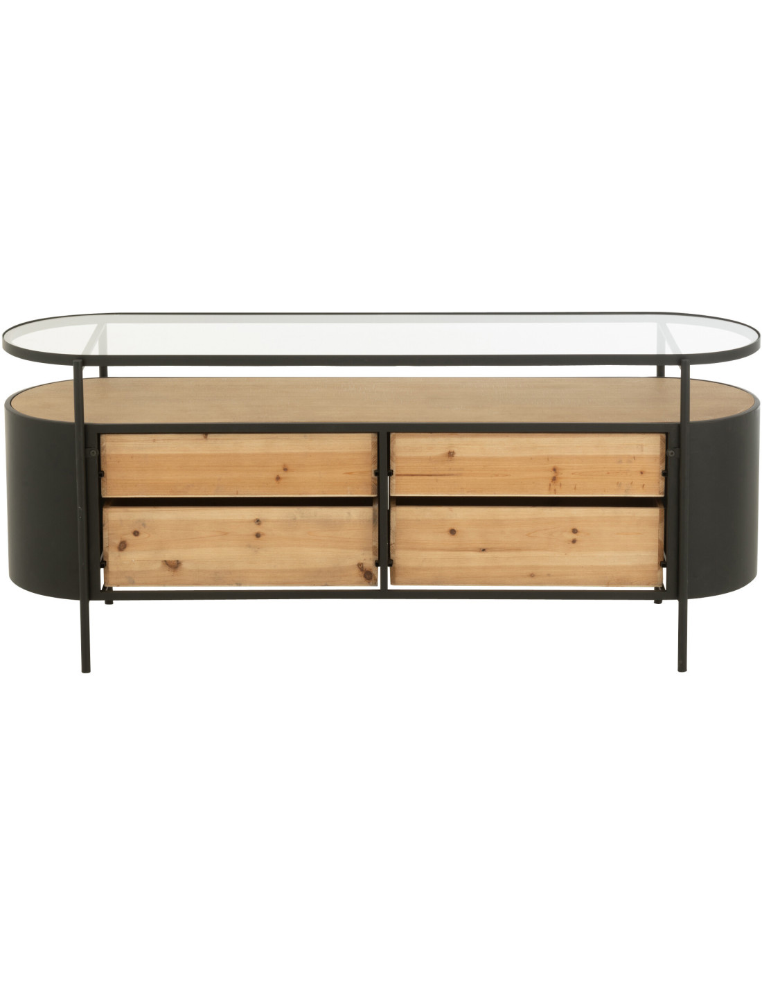 Meuble télé industriel moderne Arrondi 4 tiroirs 2 étagères en Métal Noir Bois Naturel Verre Transparent