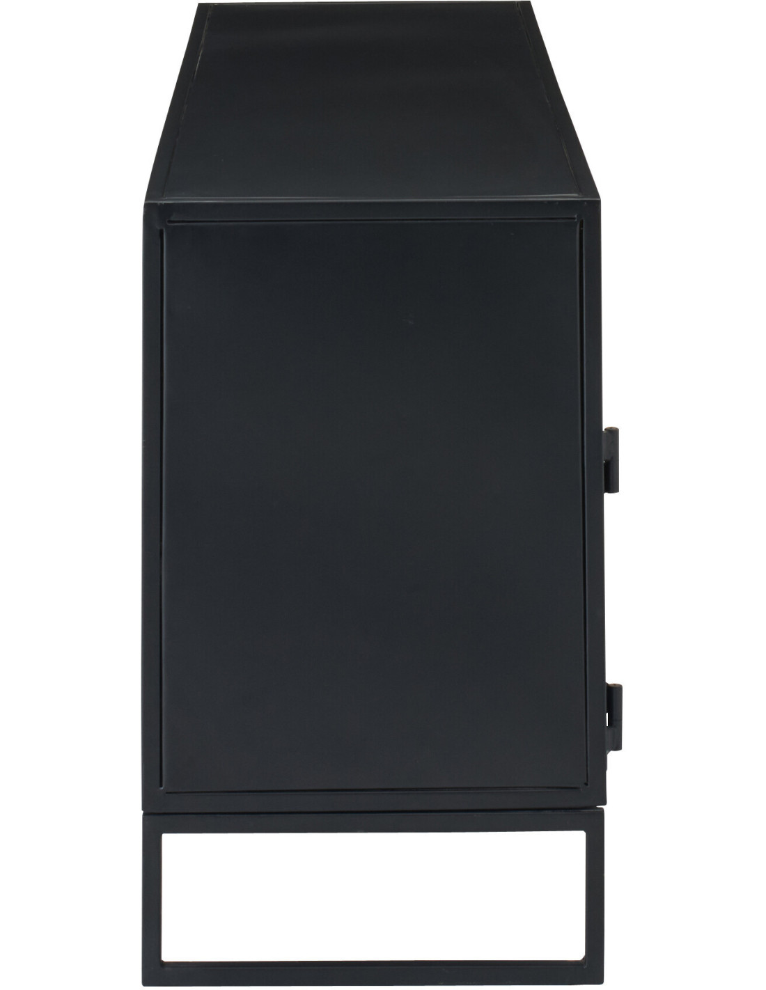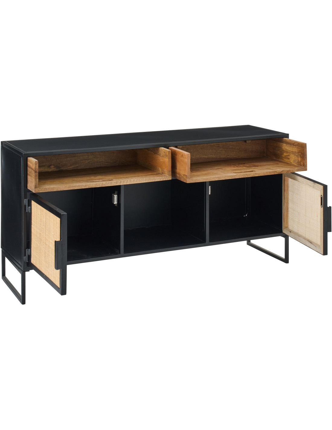 Meuble tv design rétro chic 2 portes 3 niches 122 cm Métal Noir Rotin Naturel Cannage Bois de manguier Riet