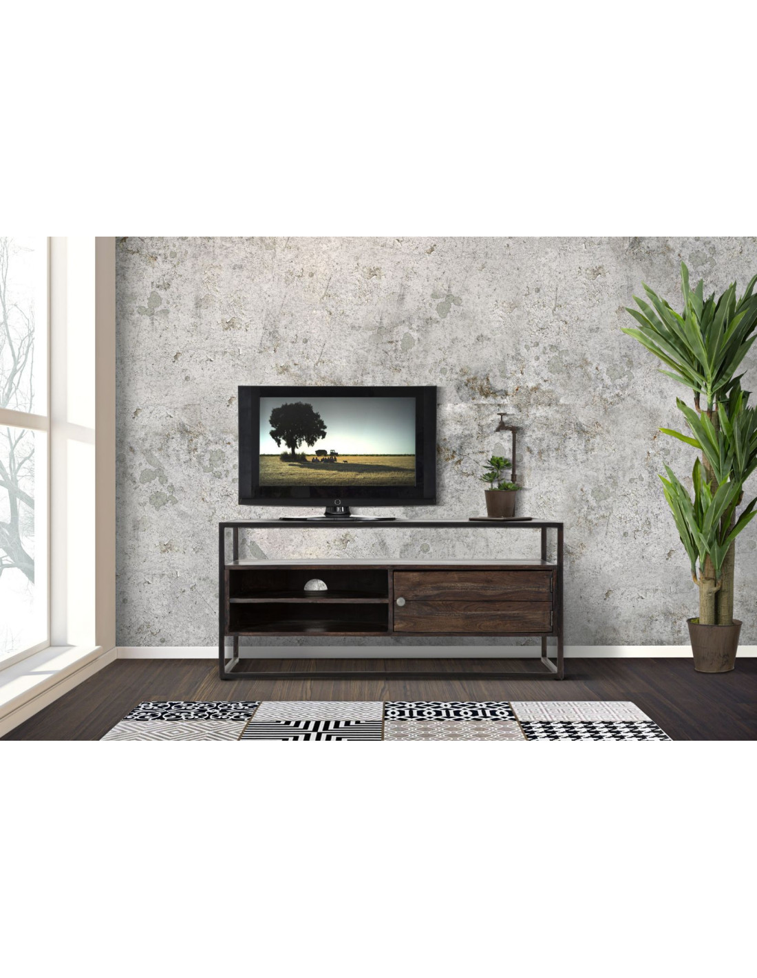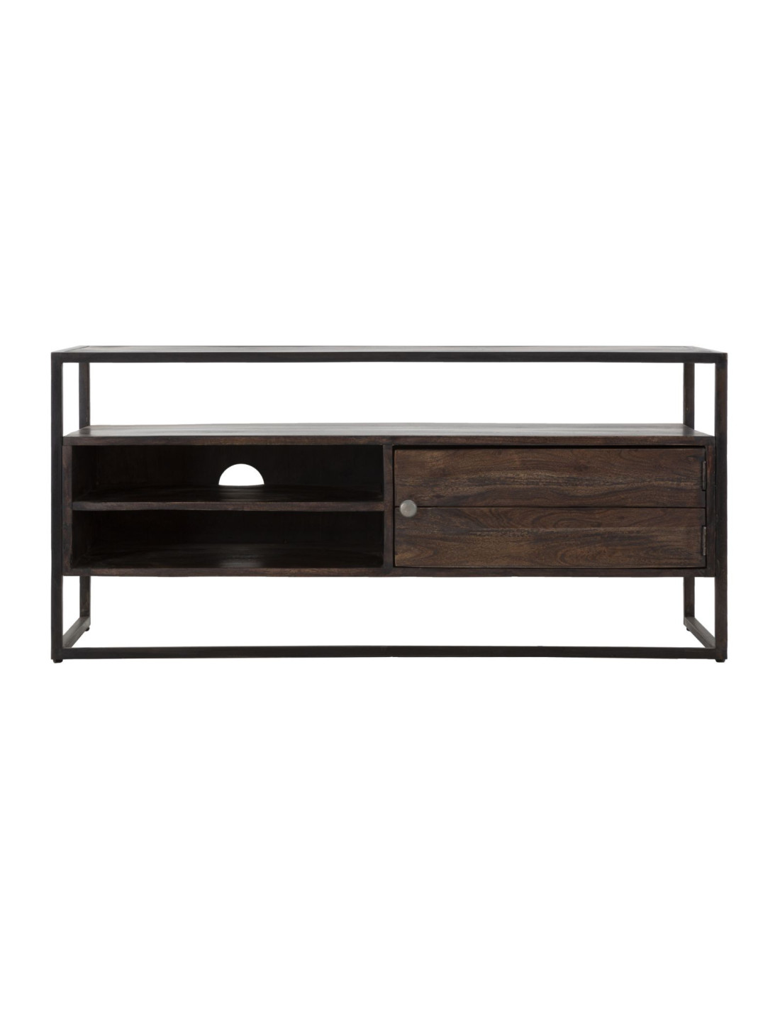 Meuble tv moderne 1 porte 2 niches 1 étagère en Bois d'acacia Marron Métal Noir Burn