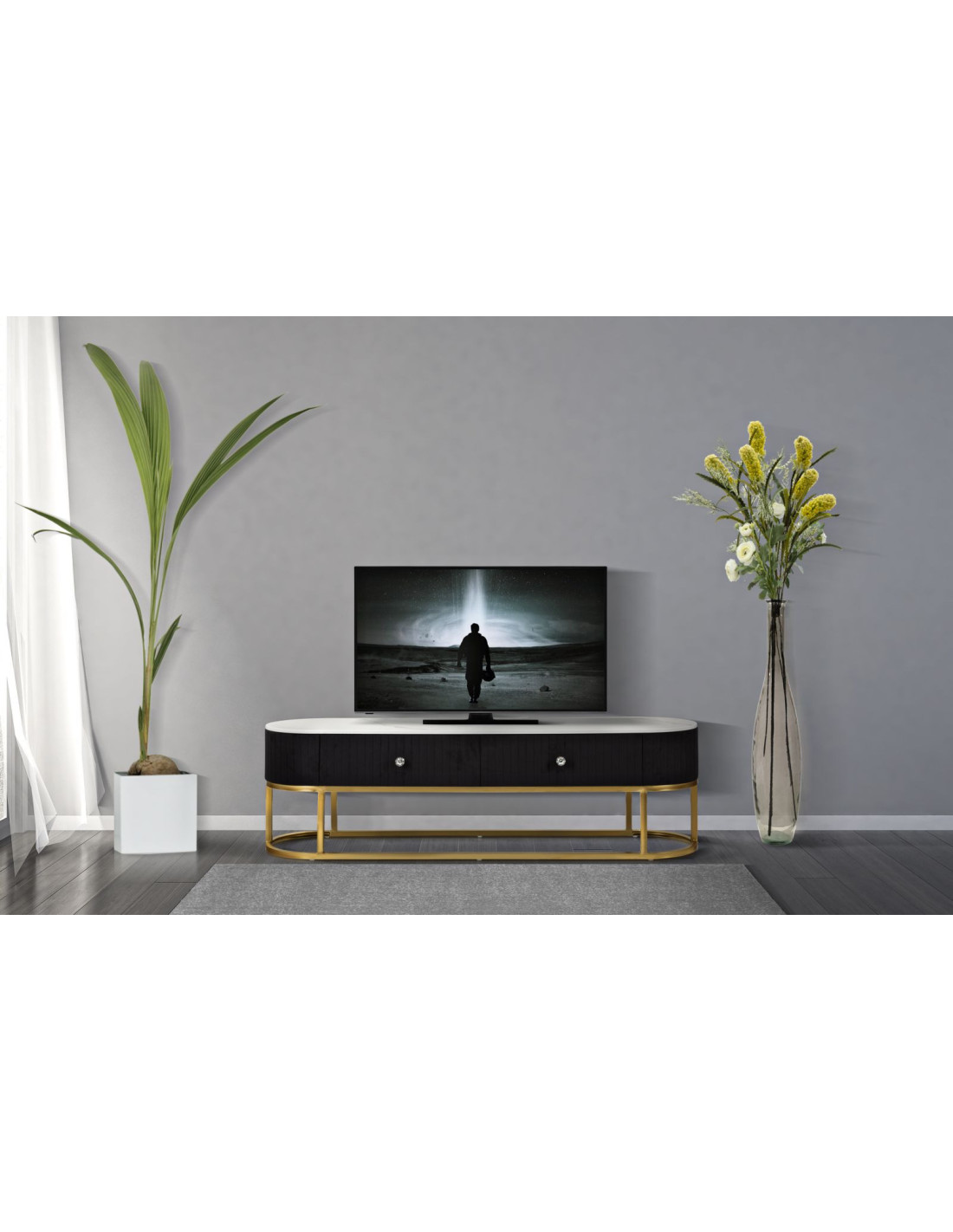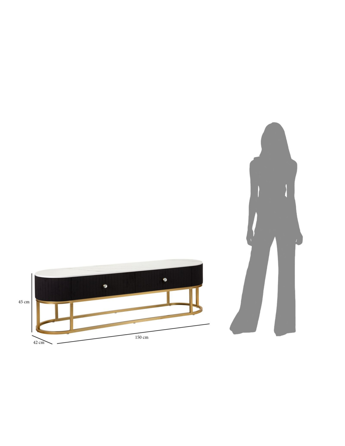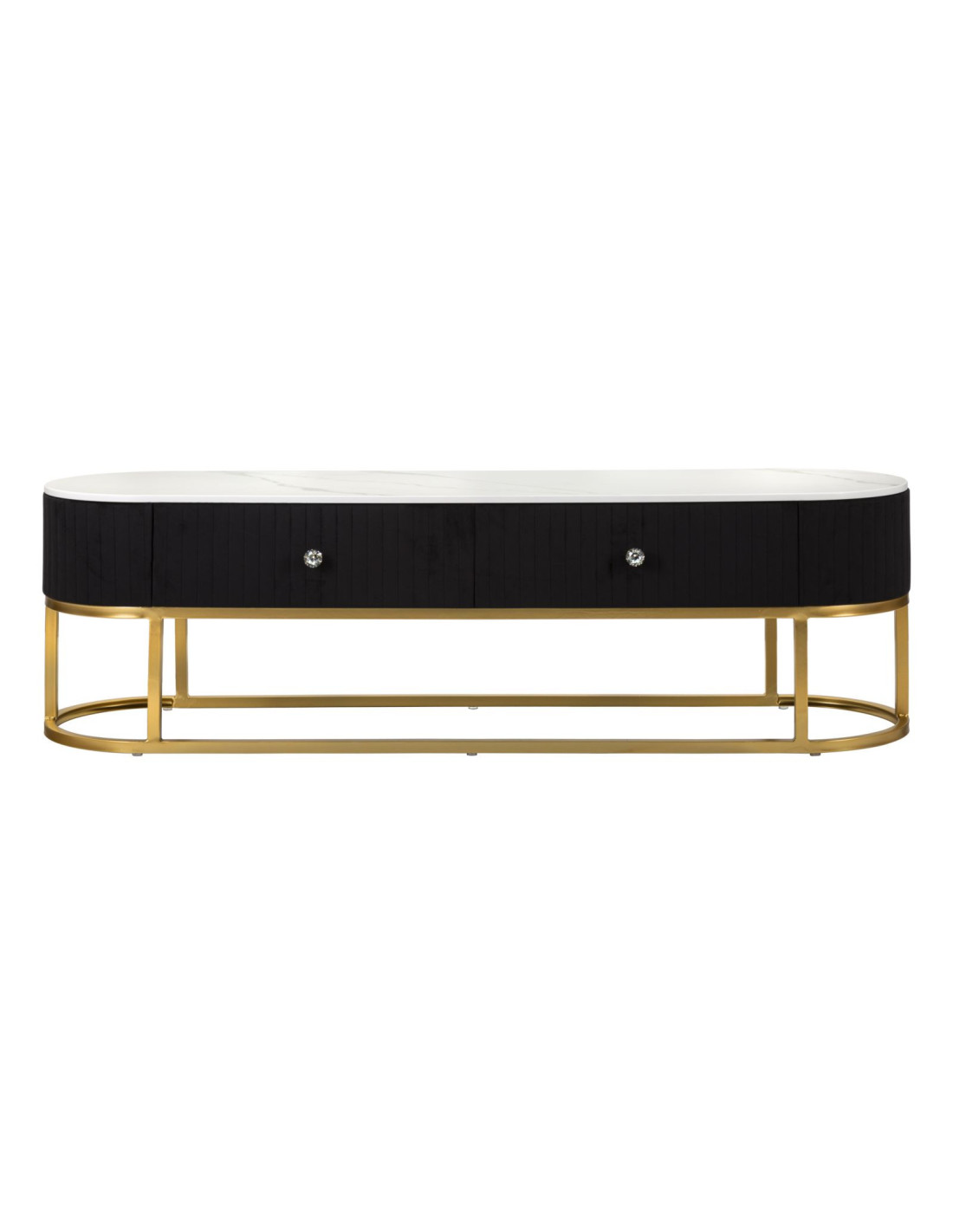 Meuble tv moderne 2 tiroirs en Velours Noir Métal Doré Bois Blanc Effet marbre Montpellier