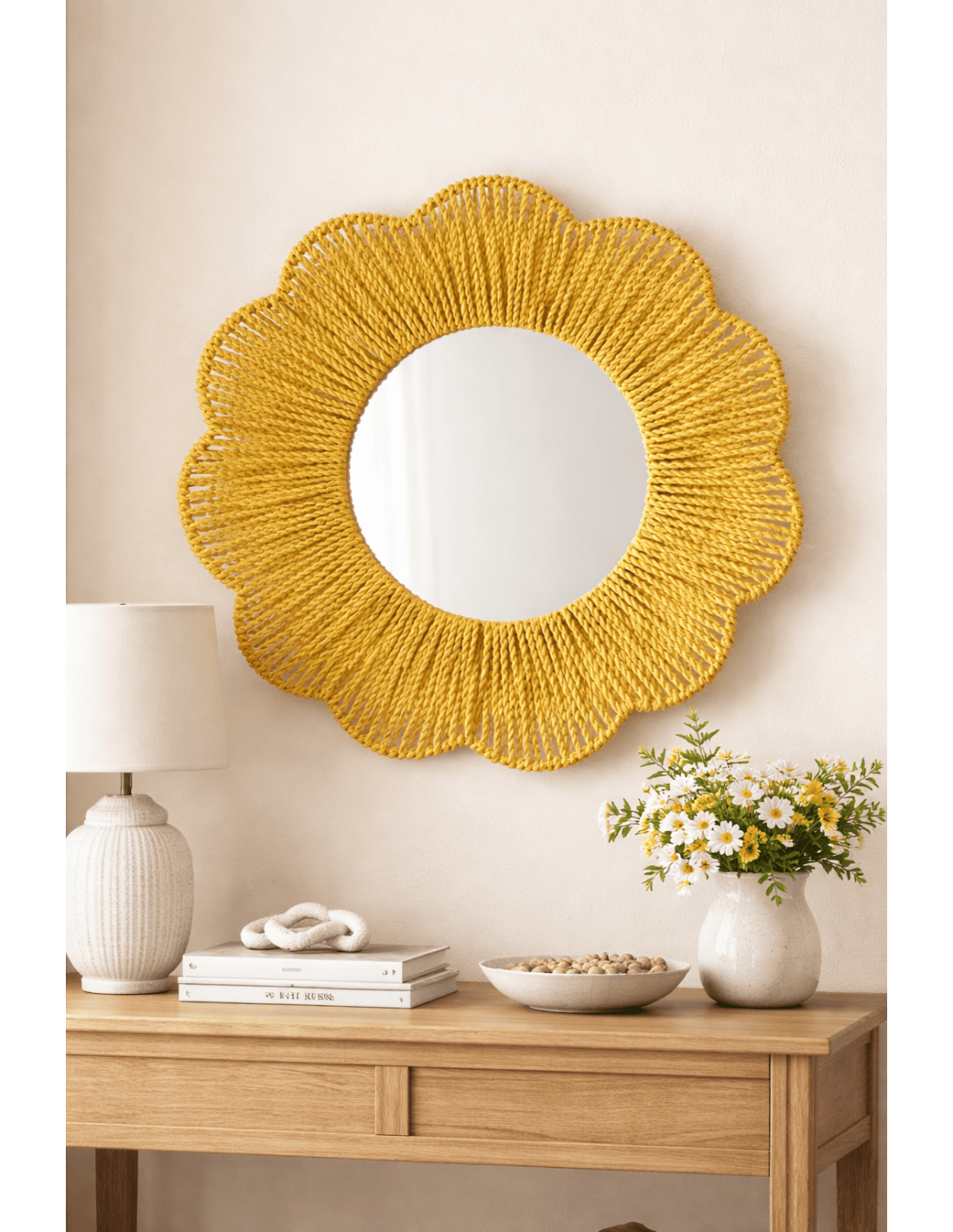 Sa teinte jaune illumine instantanément un mur. Associé à des tons neutres ou naturels, ce miroir insuffle une énergie douce et chaleureuse.
