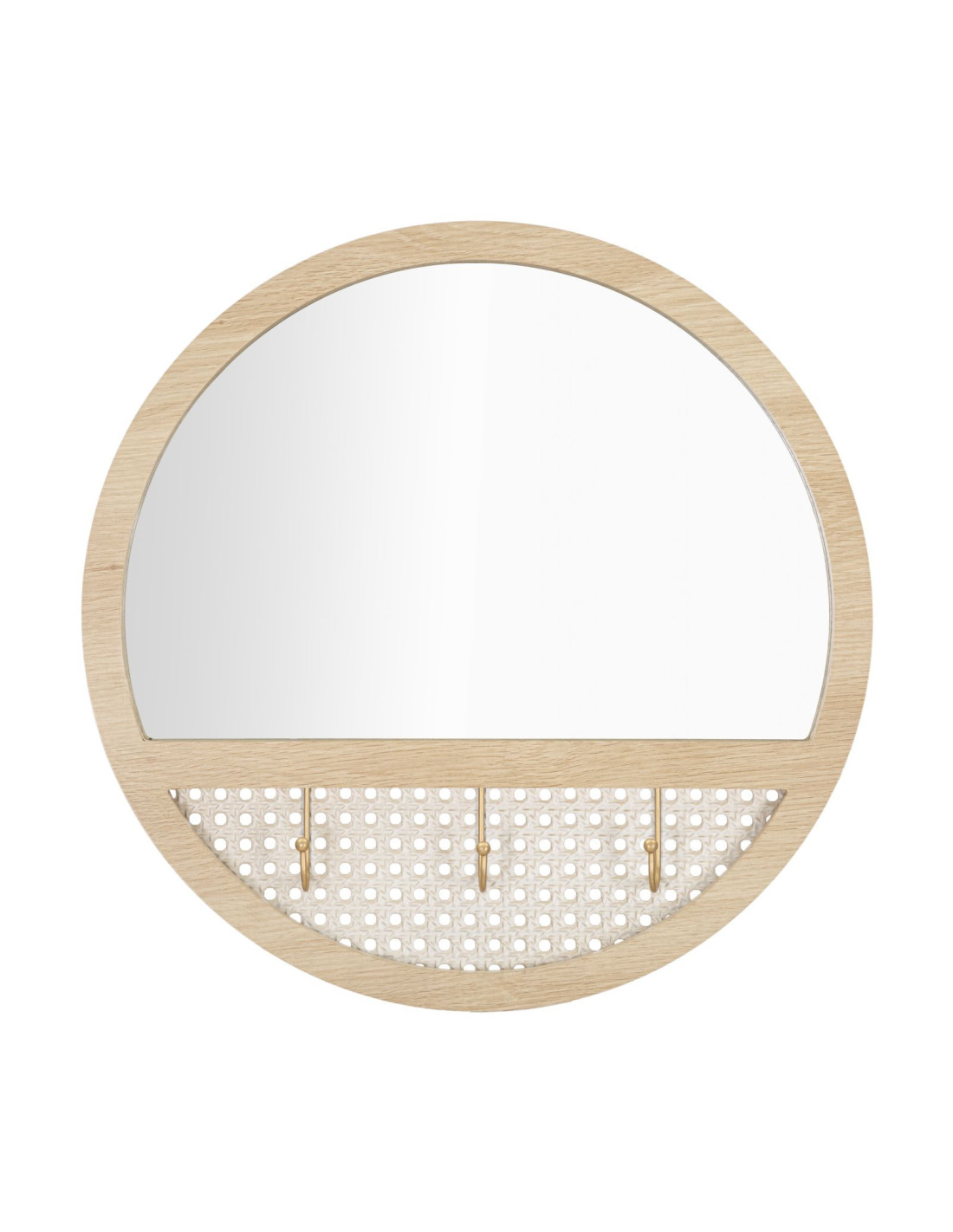 Miroir mural d'entrée bohème chic Rond 3 crochets 50x50 Bois MDF Naturel Métal Effet cannage Fuji