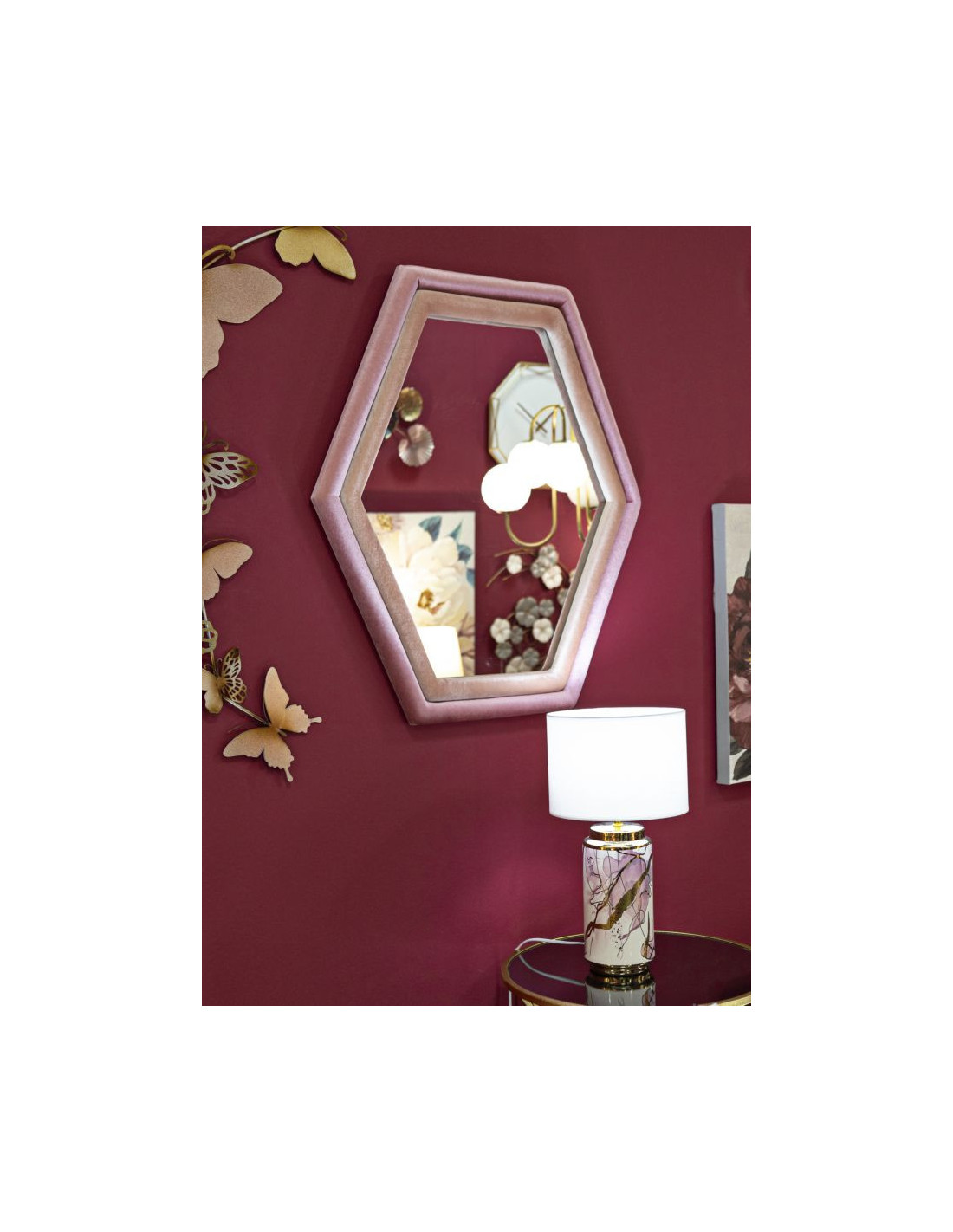 Miroir mural original Hexagonal 75x80 en Velours Rose Bois Tony