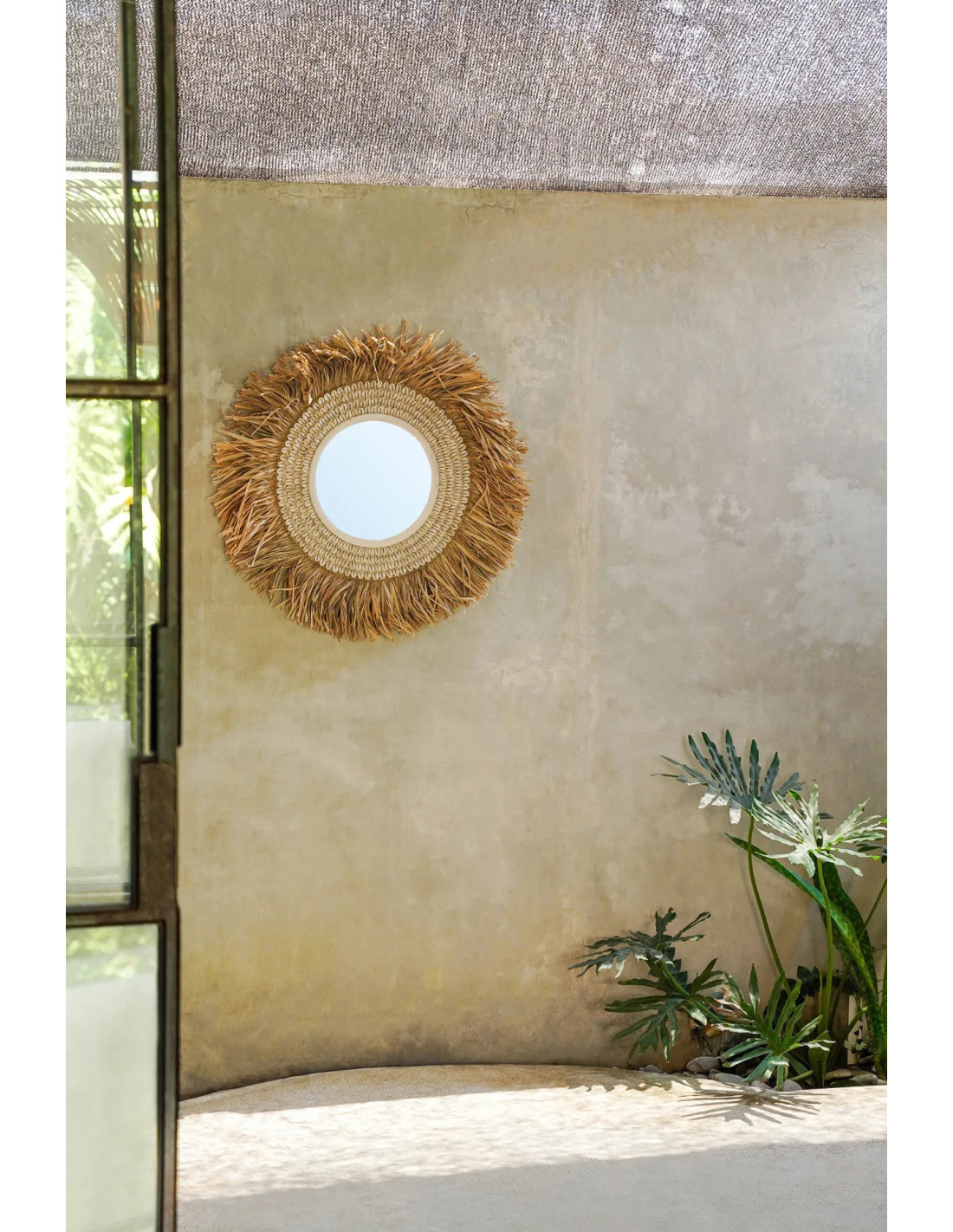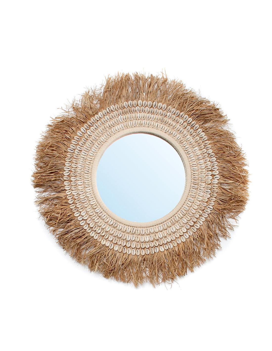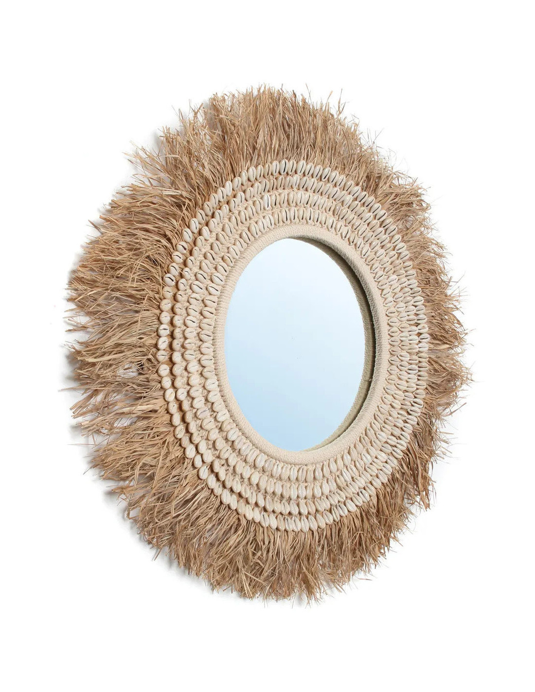 Miroir Mural Rond 75 cm en Raphia Naturel Coquillage Blanc The Raffia Cowri