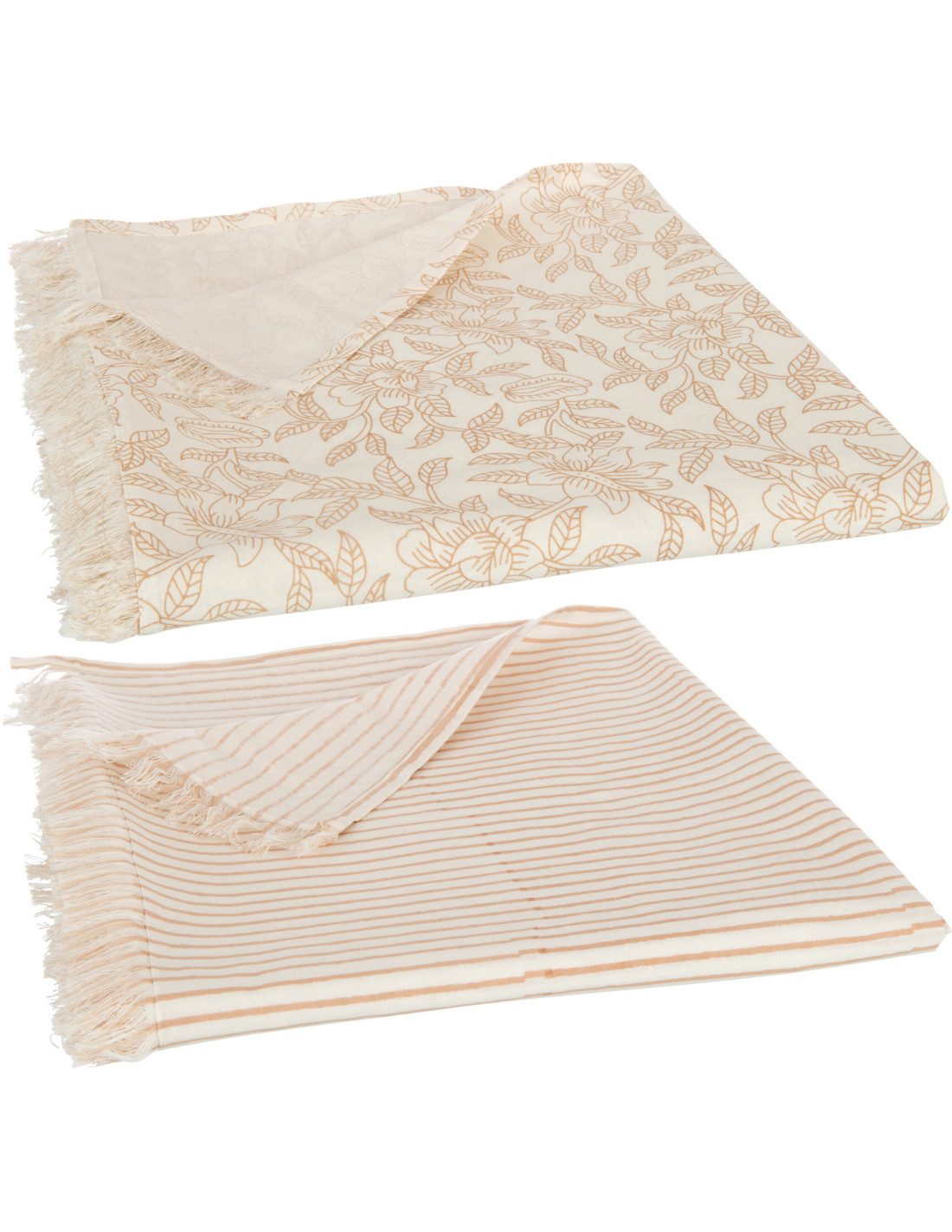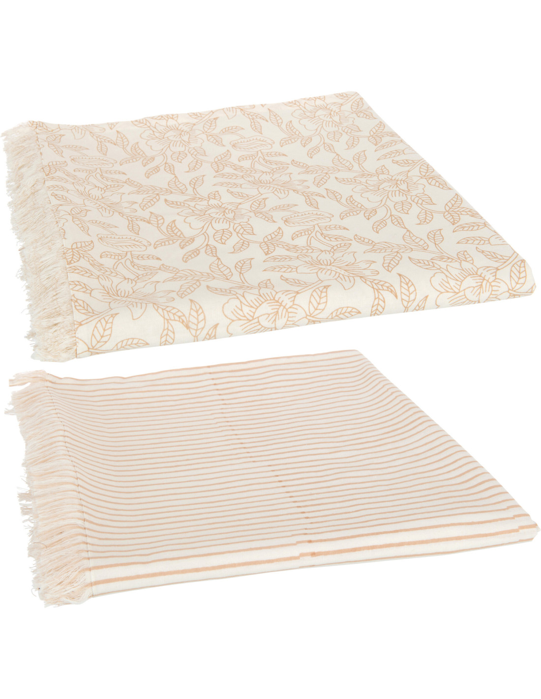 Nappe Rectangulaire Indi 135x275 en Coton Beige Taupe Motif Lignes & Feuilles Avec franges (Lot de 2)