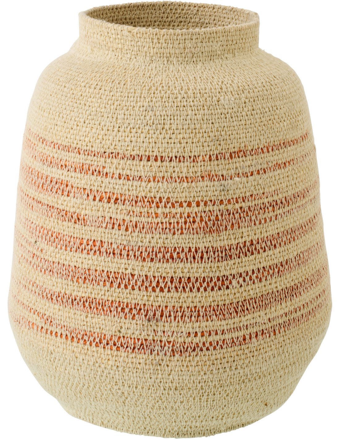 Ce panier capte immédiatement le regard par ses nuances terracotta subtilement intégrées dans le tressage. Il évoque une atmosphère douce, inspirée par les terres chaudes et les matières brutes.