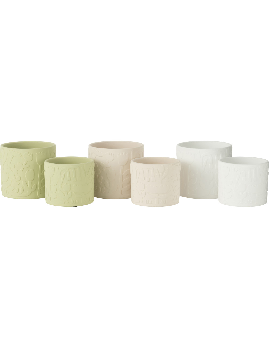 Petit Cache pot moderne Rond Diamètre 12 cm en Terre cuite Vert Beige Blanc Motif fleurs Aloha (Lot de 3) - 1