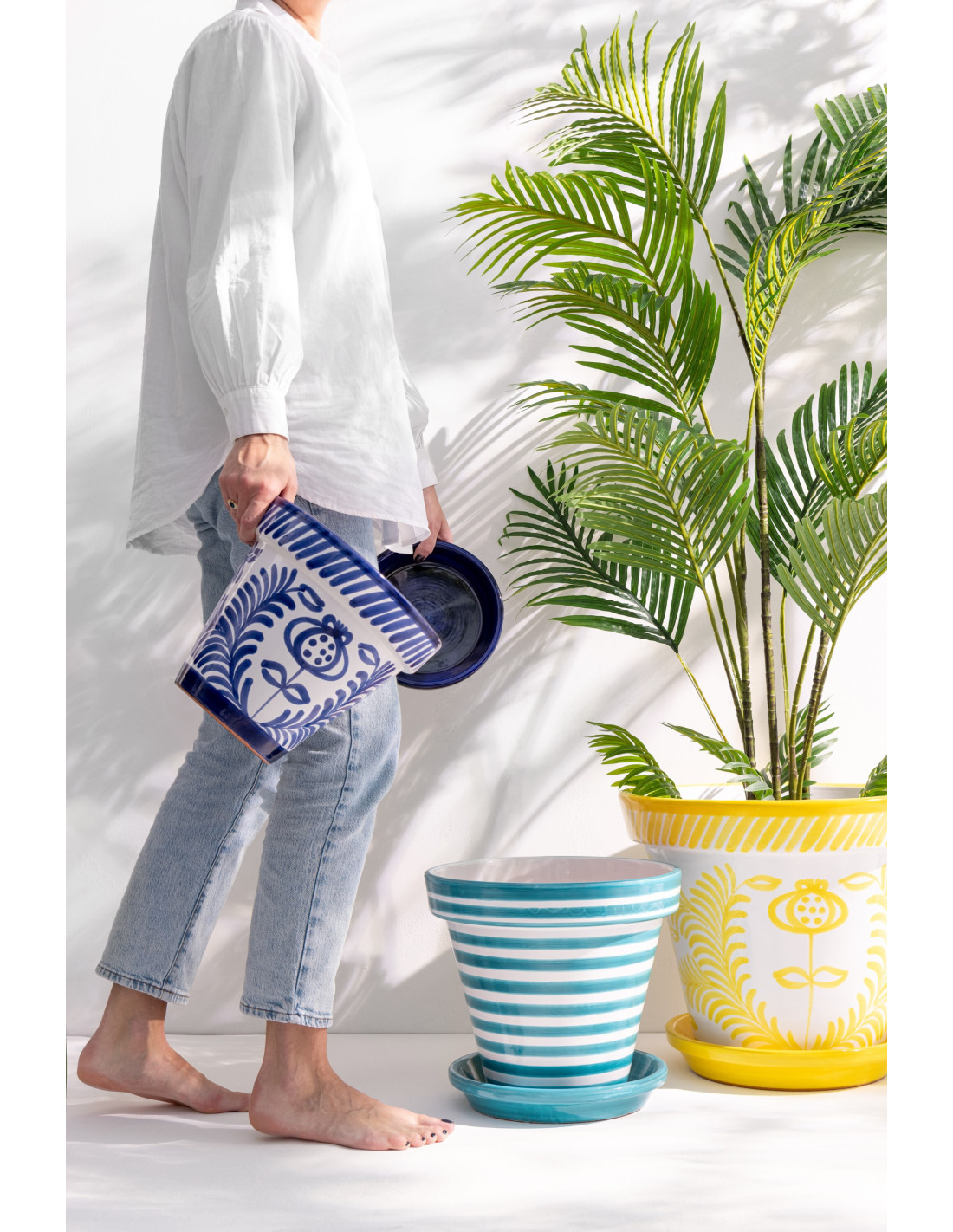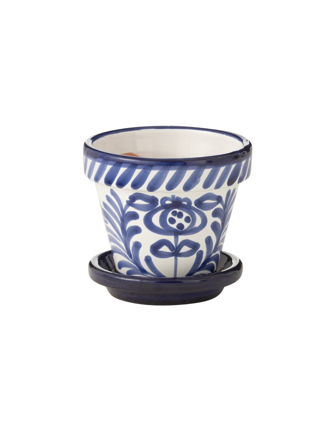 Petit Cache pot original extérieur Rond Diamètre 17 cm en Céramique Bleu cobalt Blanc Motif fleur Granada