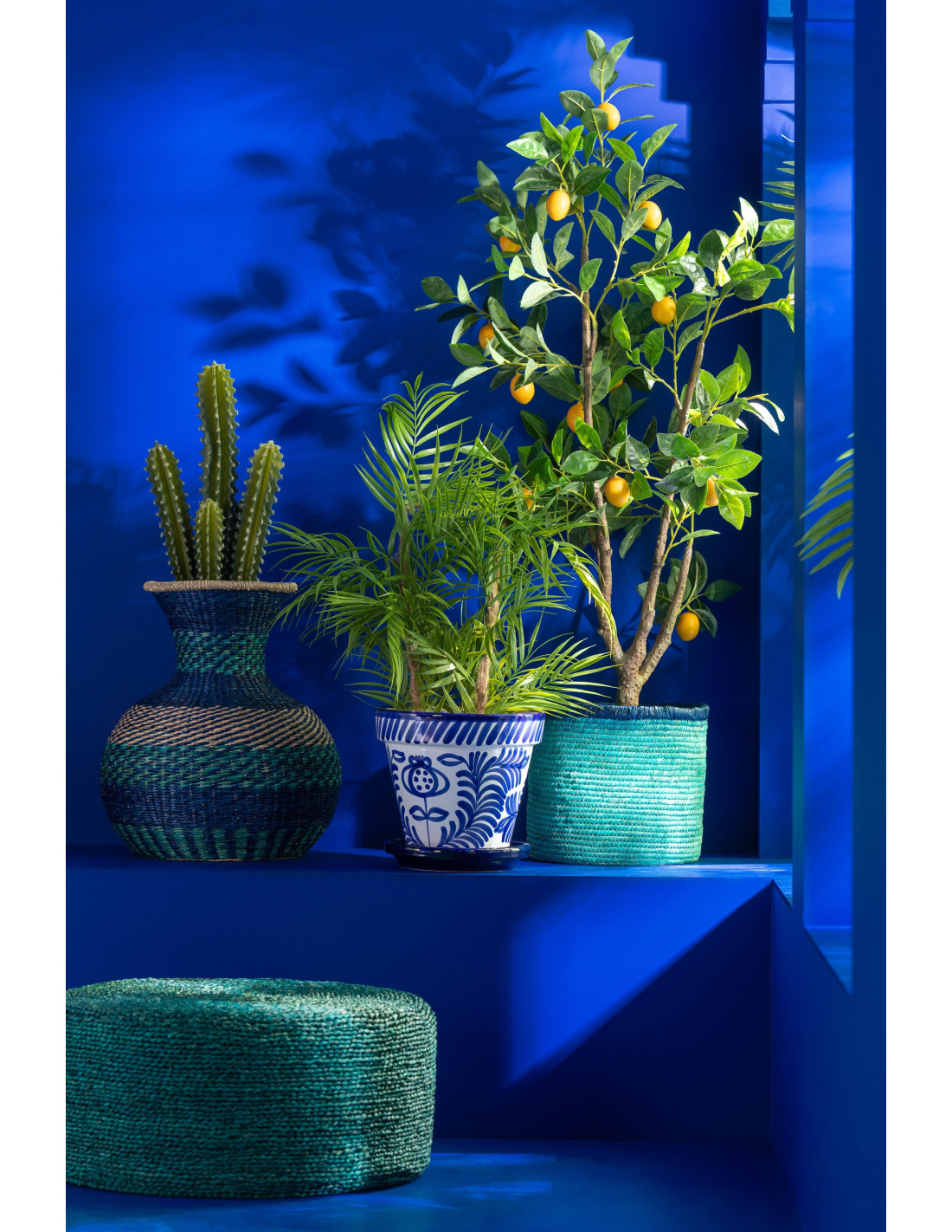 Petit Cache pot original extérieur Rond Diamètre 17 cm en Céramique Bleu cobalt Blanc Motif fleur Granada - 1
