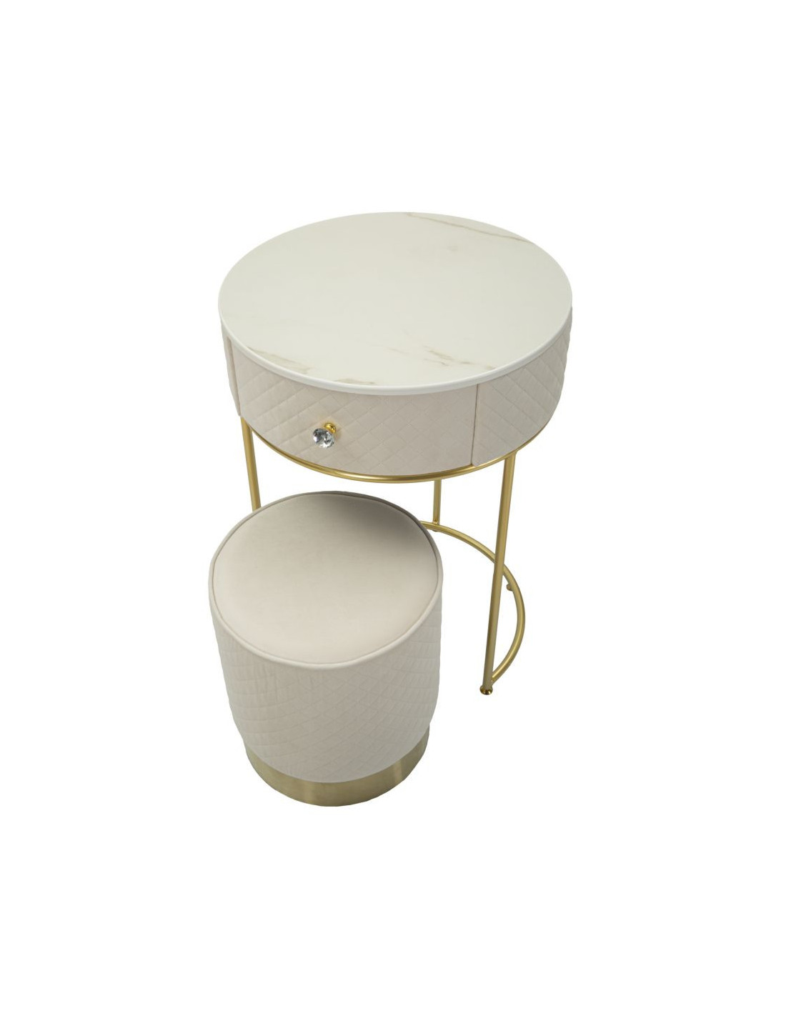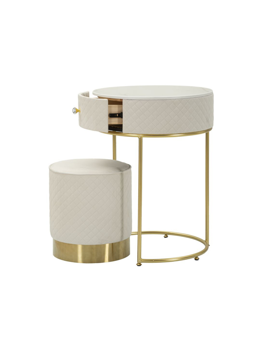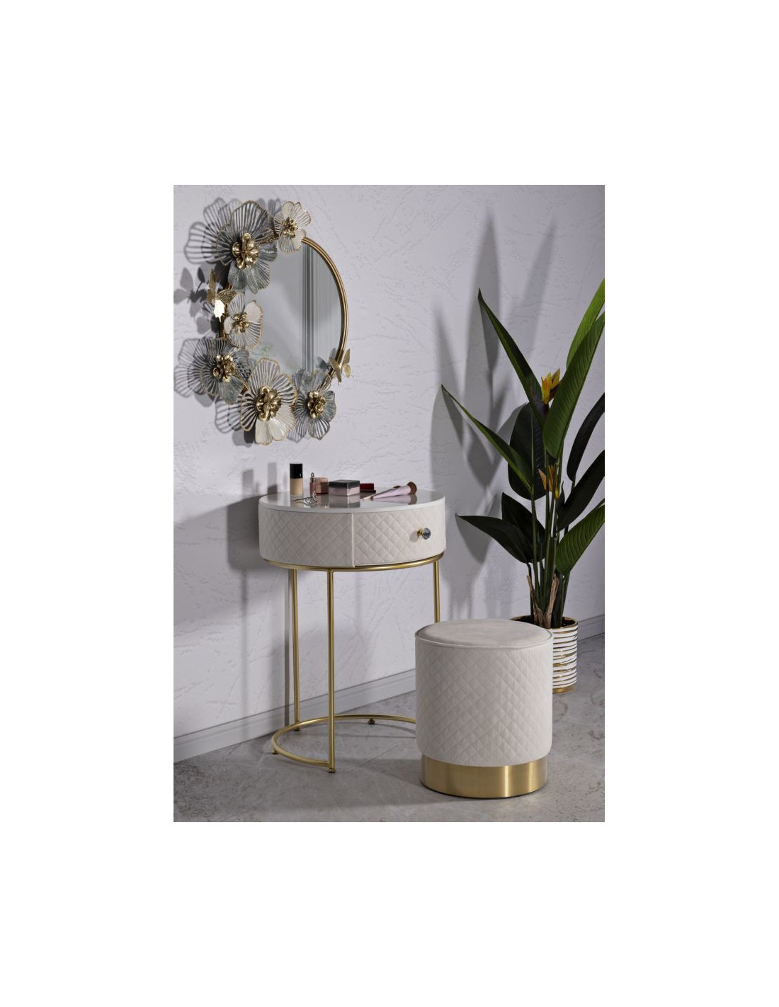 Petite Coiffeuse avec pouf Ronde 1 tiroir Velours Blanc crème Bois MDF Métal Doré Vellit
