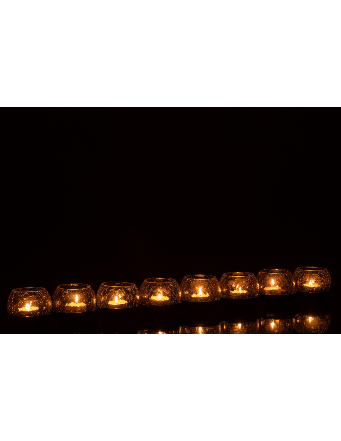 Chaque boule en verre craquelé capte et fragmente la lumière. Une fois les bougies allumées, les reflets se multiplient, créant une atmosphère vibrante et enveloppante. L’effet est à la fois chaleureux et spectaculaire.