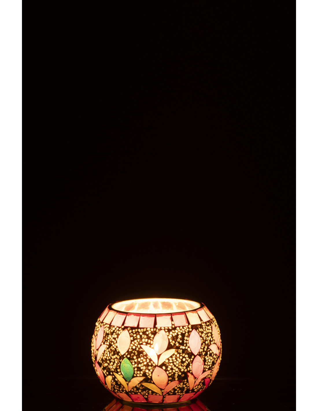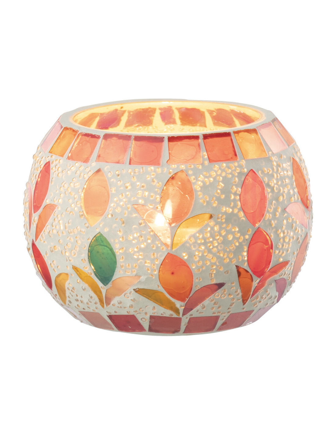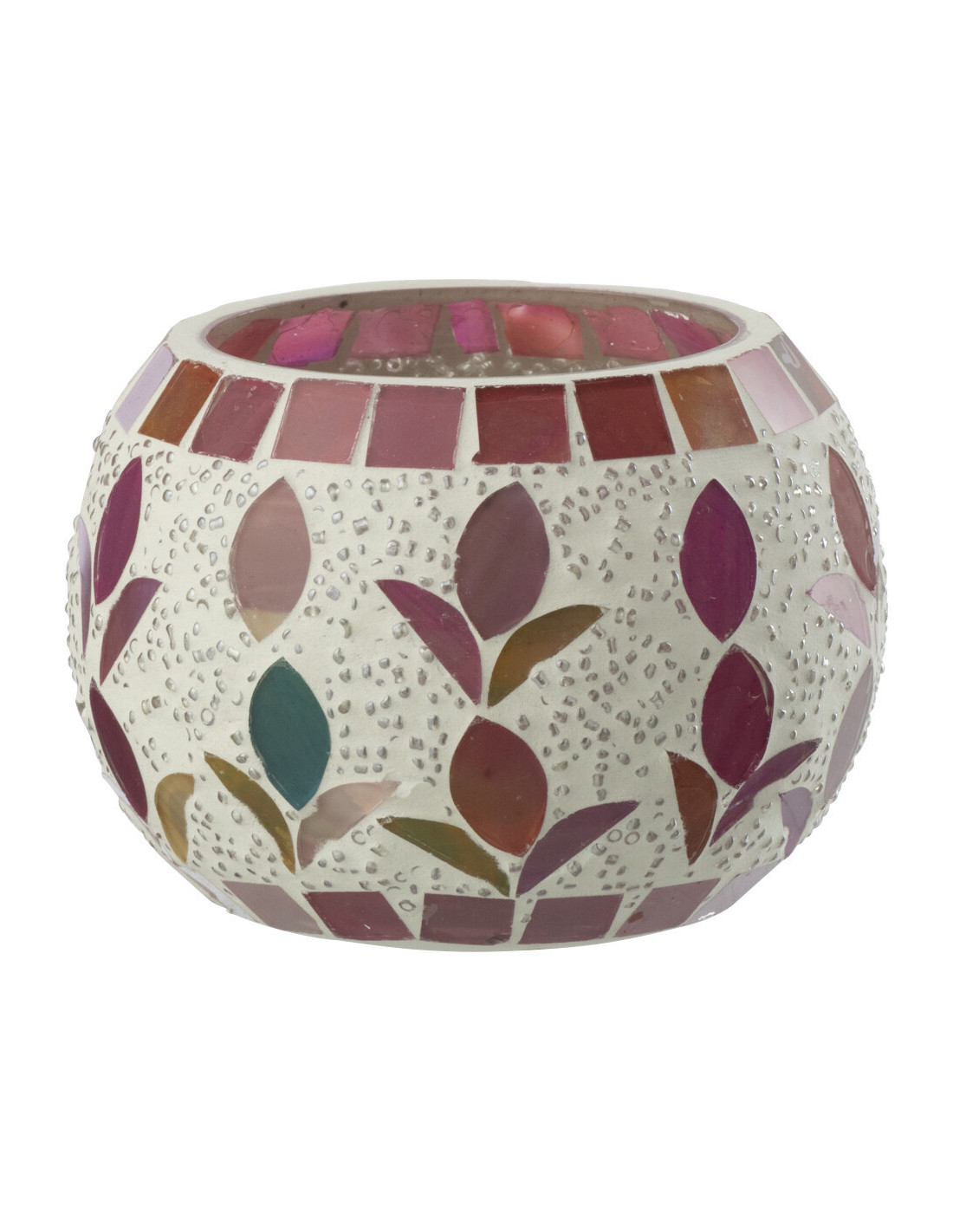 Photophore bohème D 9 cm Verre Blanc cassé Rose fuchsia Mosaïque Motif fleurs Nolika