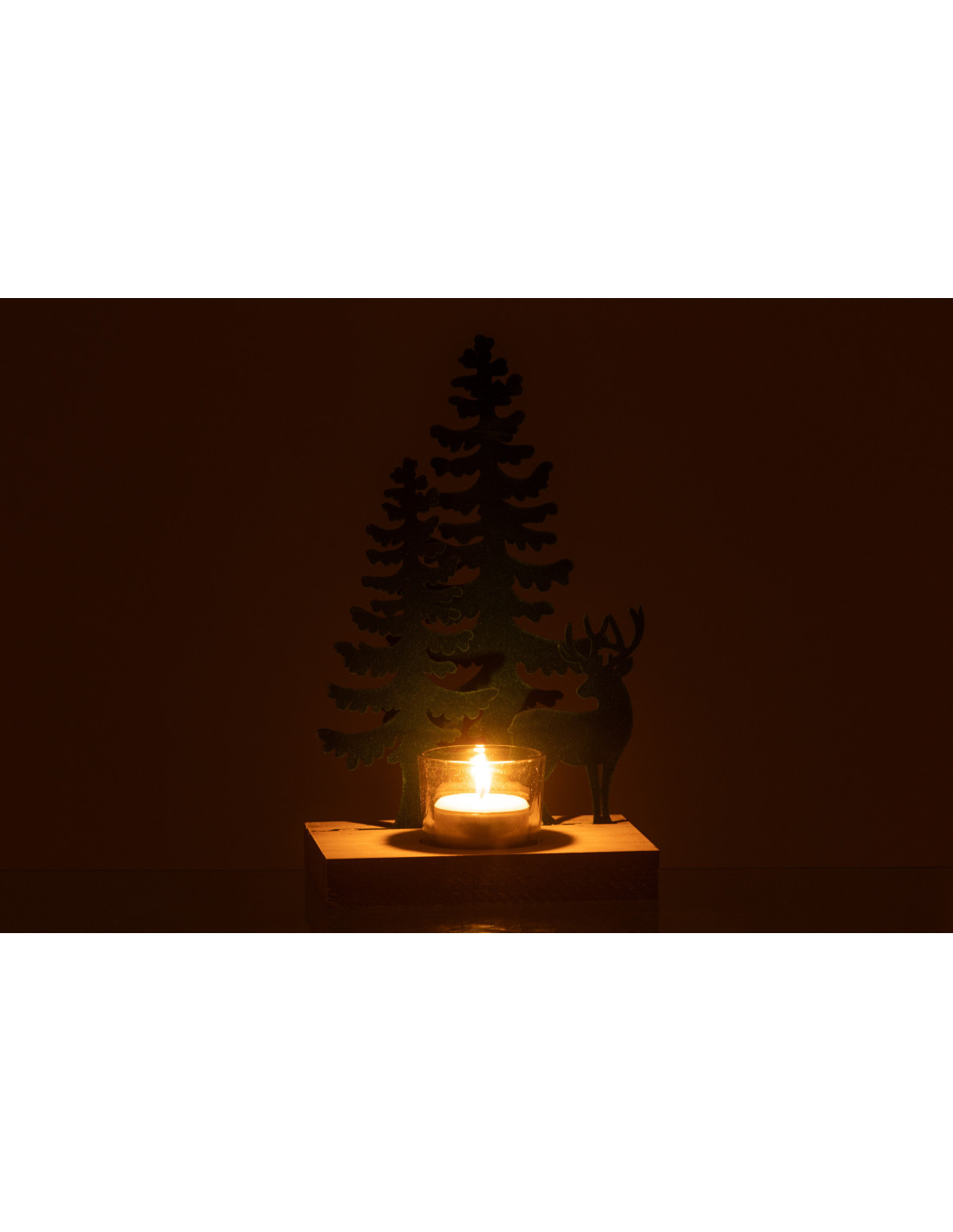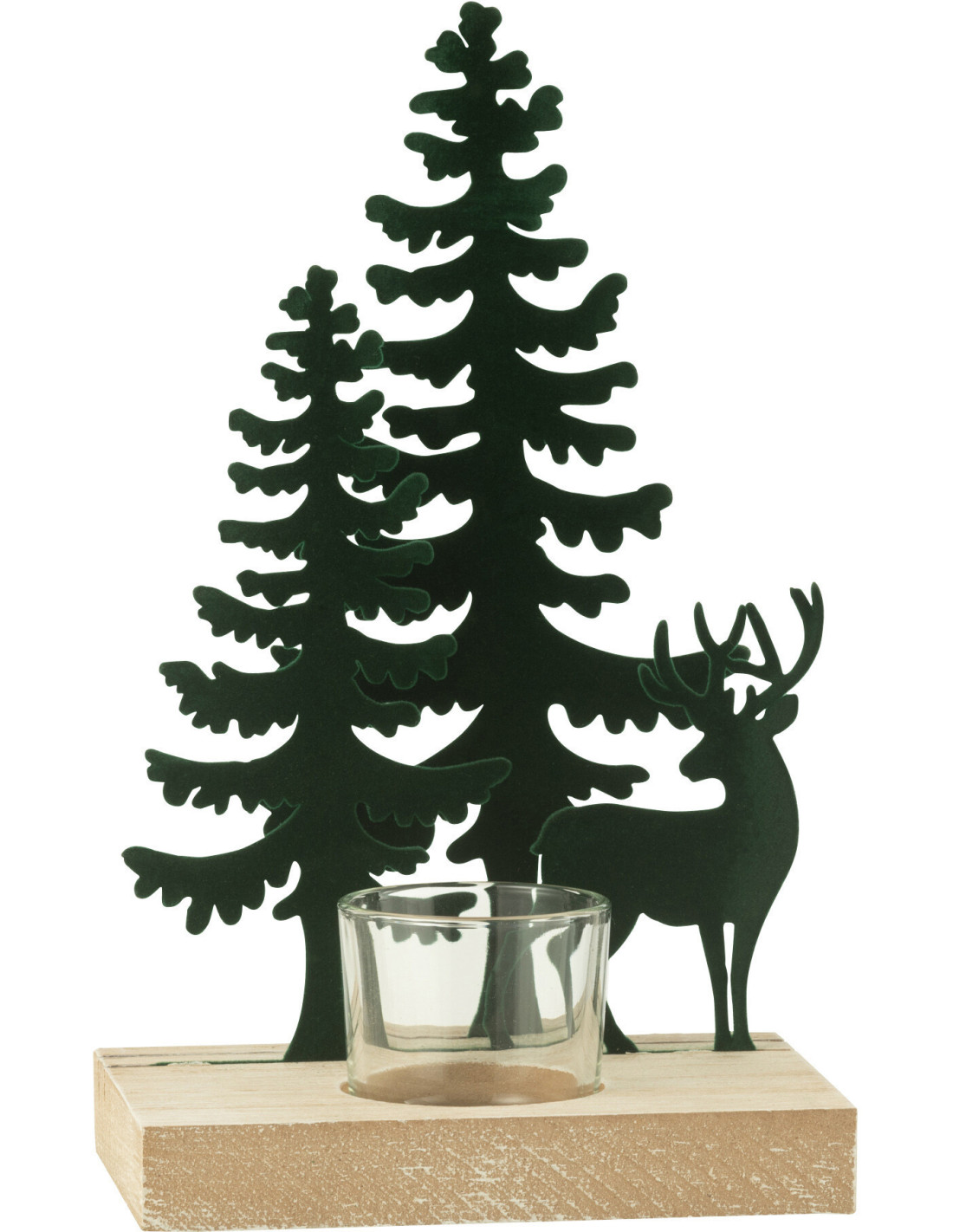 Photophore de noël 1 bougie Cerf et Sapins Hauteur 22 cm en Métal Vert foncé Bois Naturel Bellona