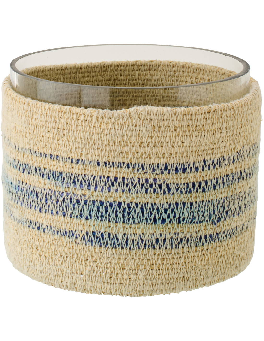 Une lumière qui traverse la matière. Ce photophore associe la transparence du verre à la chaleur des fibres naturelles, soulignées de nuances bleues. Une pièce qui évoque instantanément les ambiances bord de mer, douces et apaisantes.