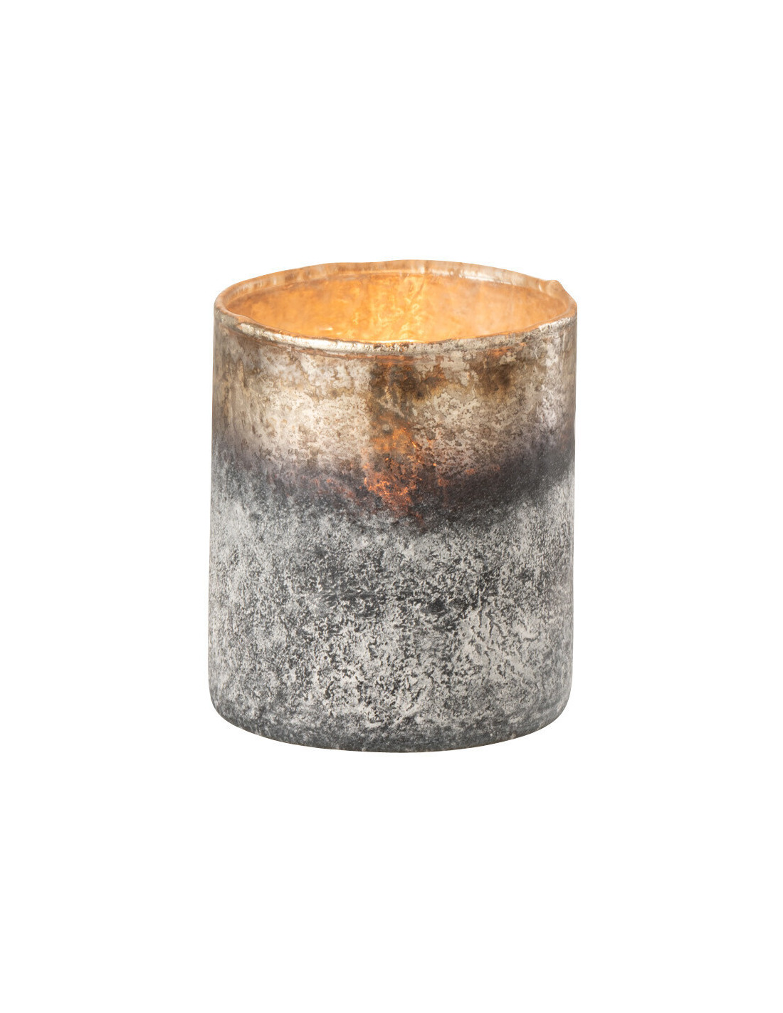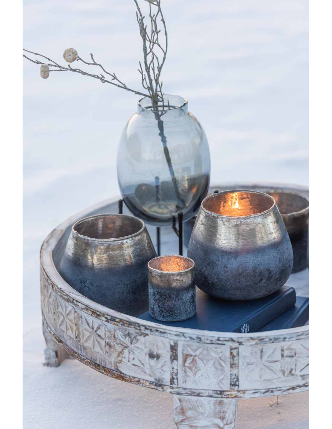 Une lumière plus profonde, presque mystérieuse. Ce photophore en verre effet fumé joue sur des nuances sombres entre bleu, gris et reflets métallisés pour créer une ambiance intime et enveloppante.