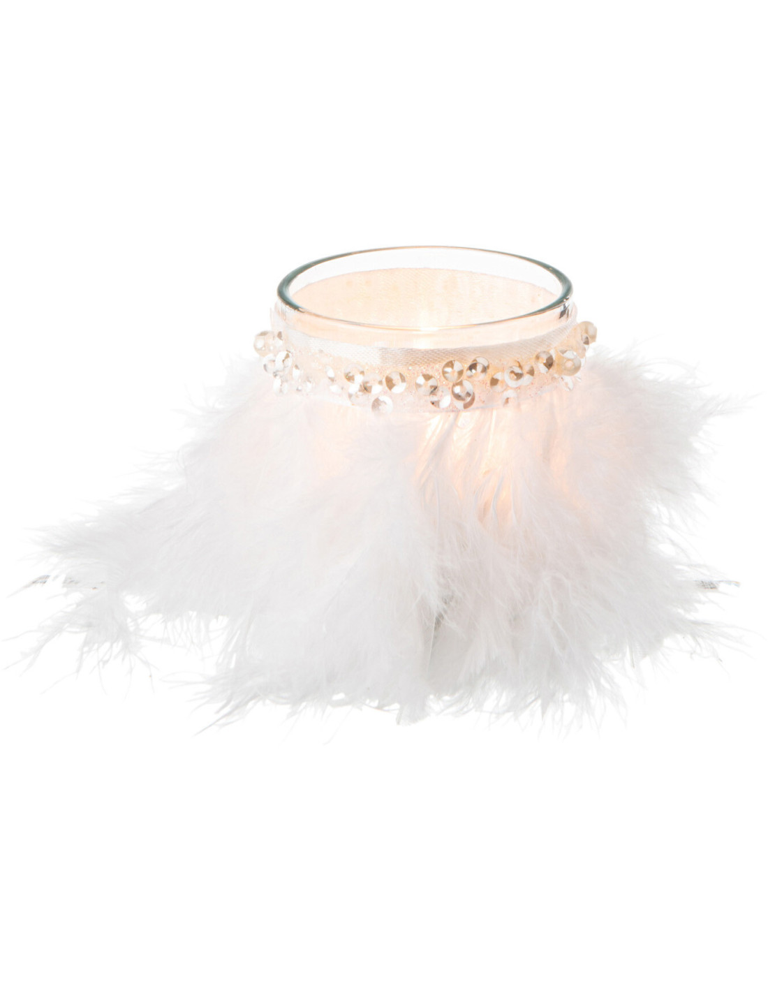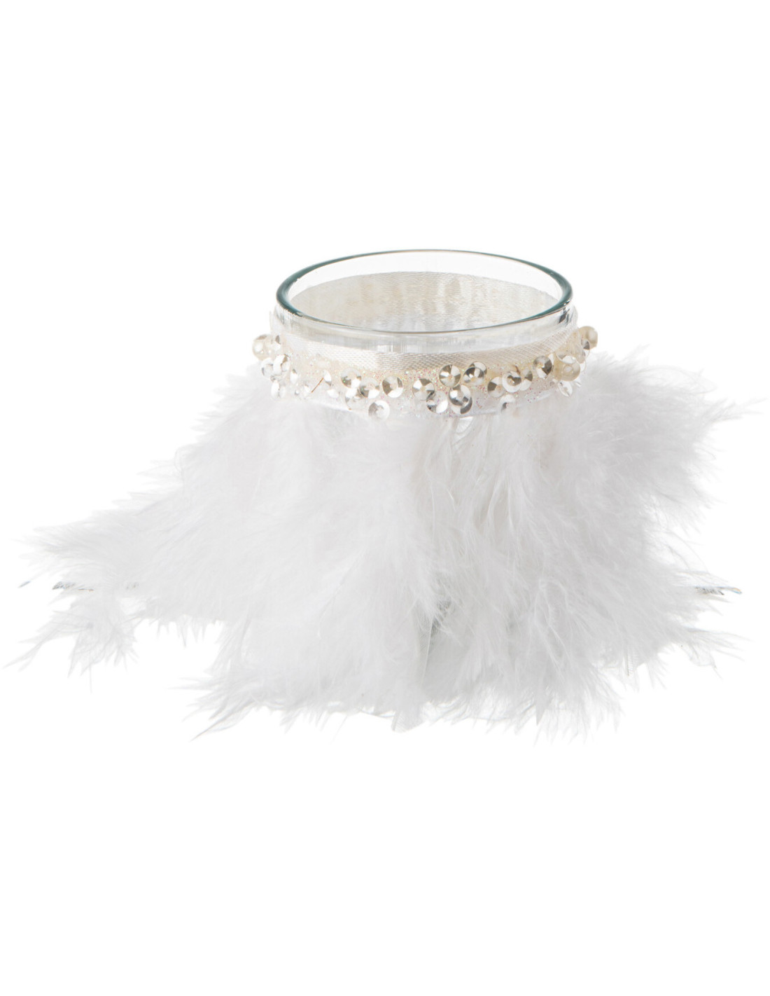 Verre transparent avec habillage en plumes blanches. Poids de 0,125 kg, léger et facile à manipuler.