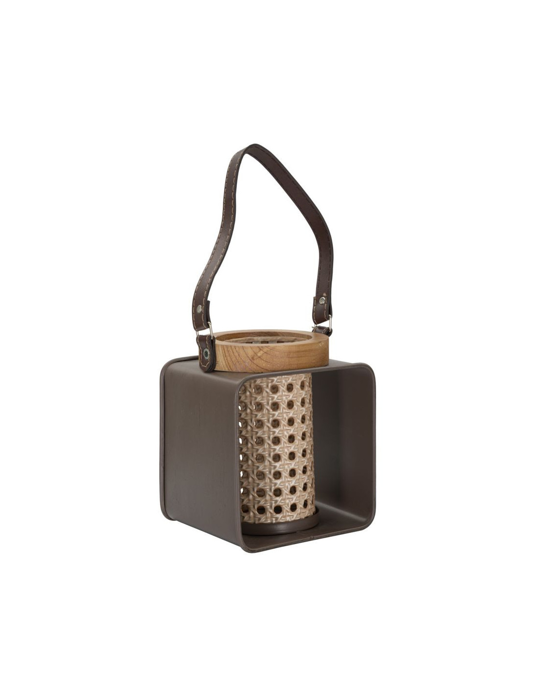 Photophore lanterne industrielle chic Métal Marron Naturel Effet cannage Bois de sapin Rattany