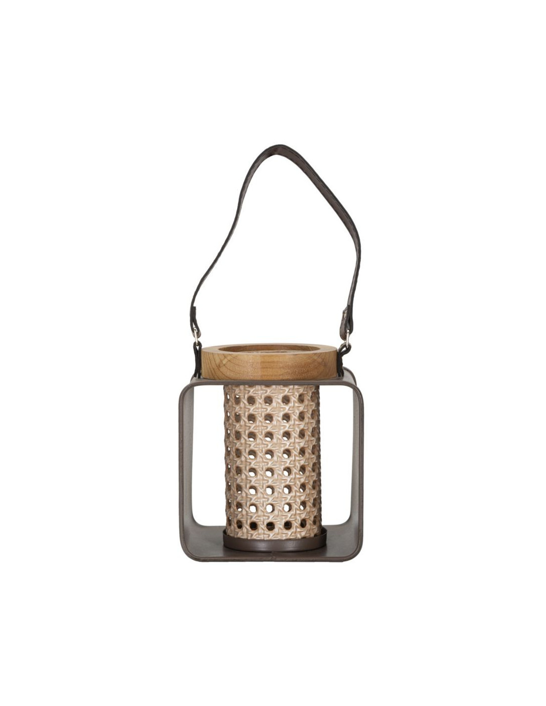 Photophore lanterne industrielle chic Métal Marron Naturel Effet cannage Bois de sapin Rattany H 20 cm