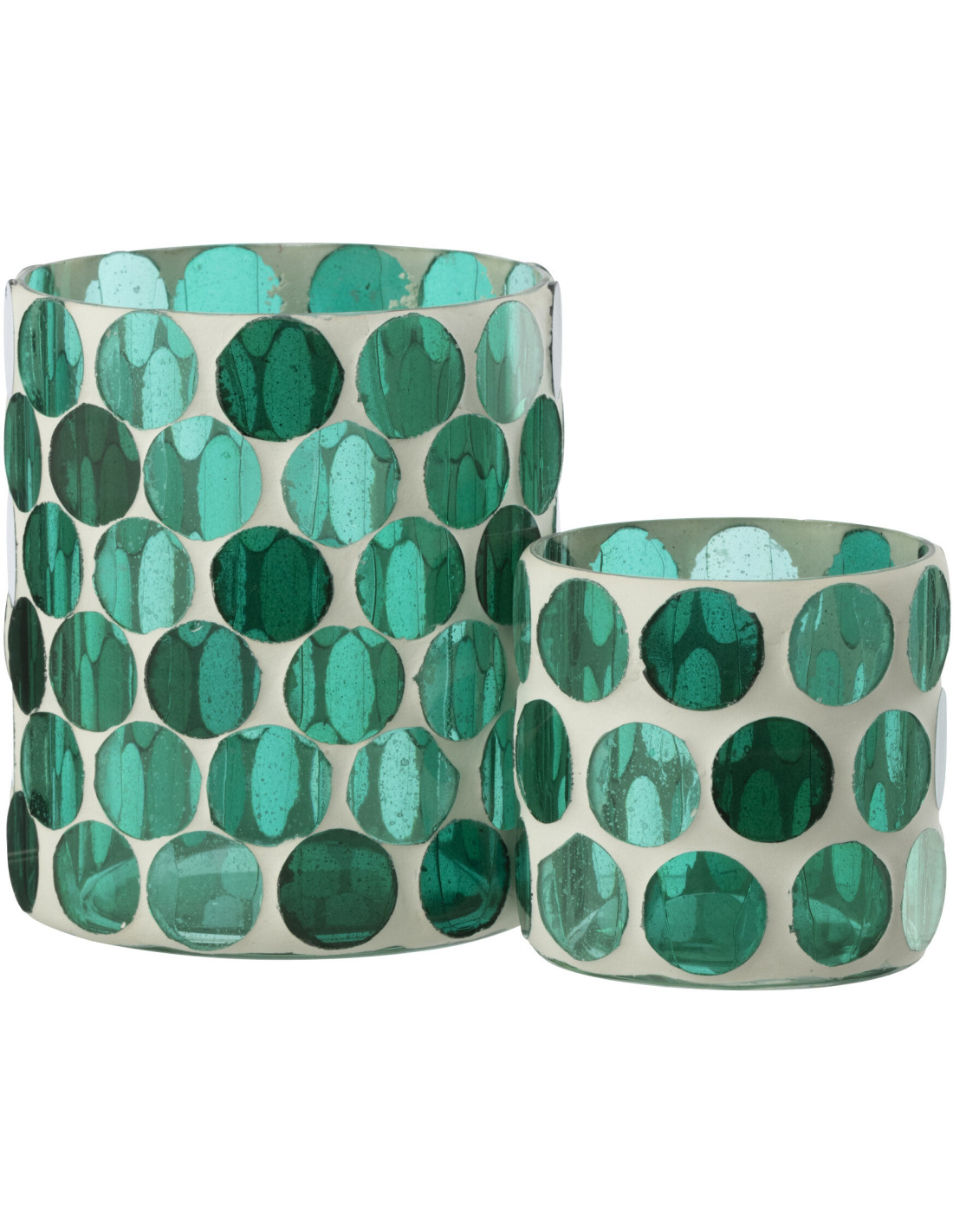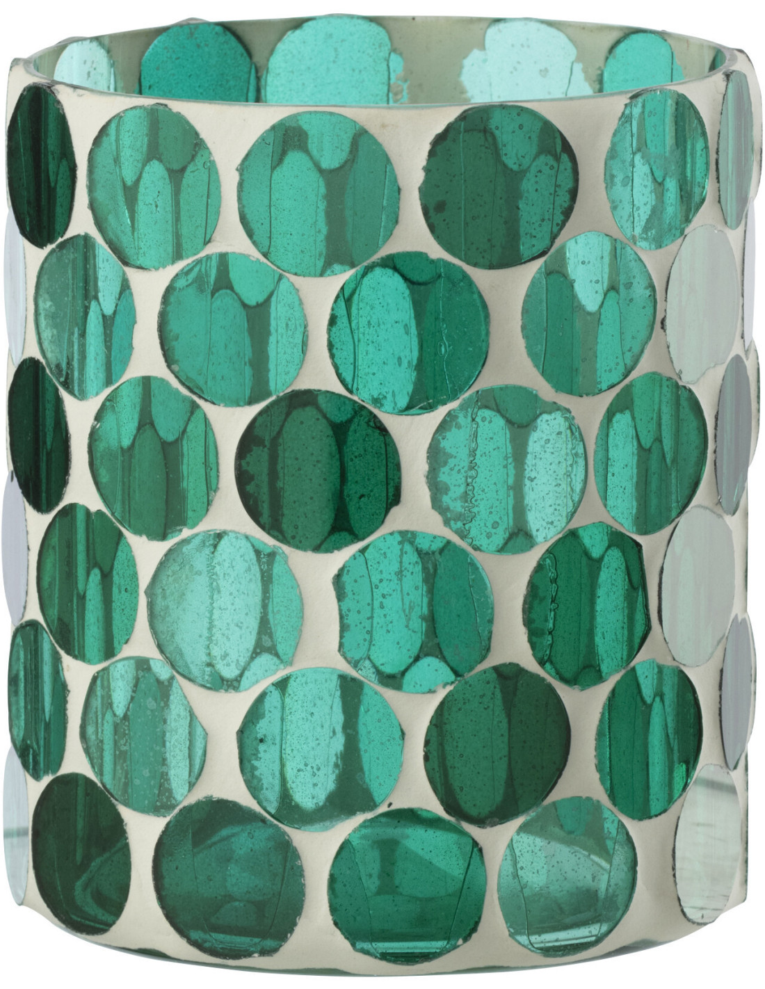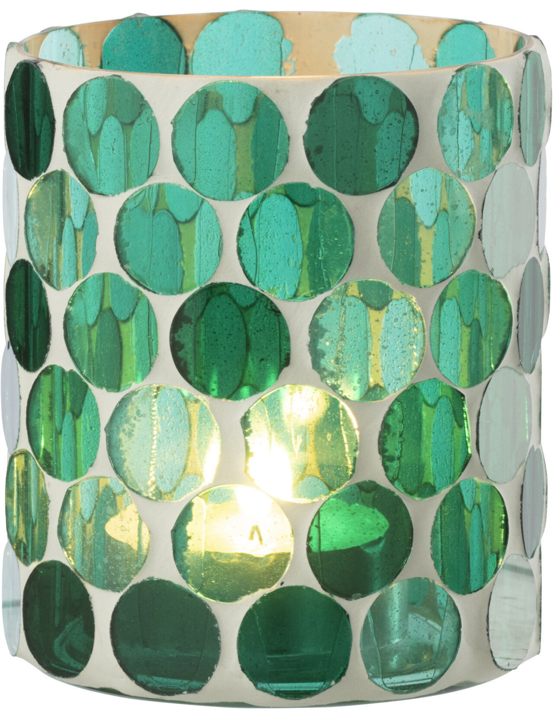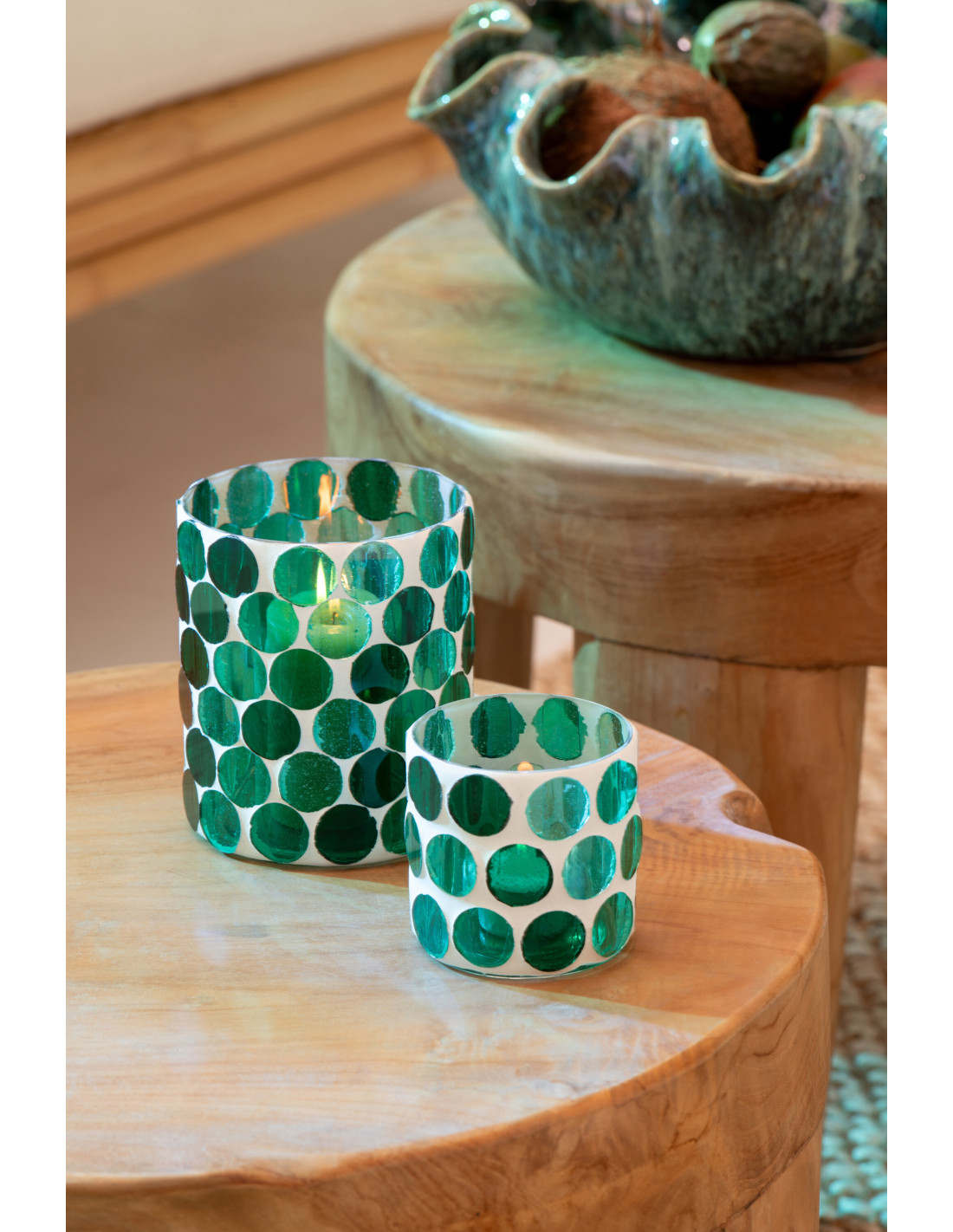 Les motifs en pastilles créent un effet visuel dynamique. Une fois la bougie allumée, la lumière traverse le verre et révèle toute la richesse des nuances.