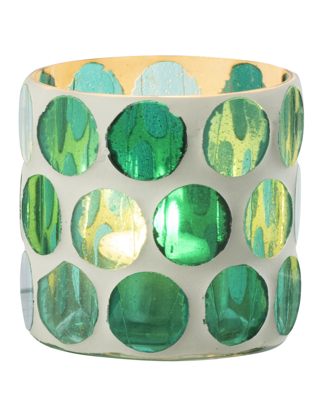 Les pastilles colorées créent un effet visuel vivant, qui se transforme une fois la bougie allumée. La lumière se diffuse en douceur à travers le verre blanc, créant une ambiance enveloppante.