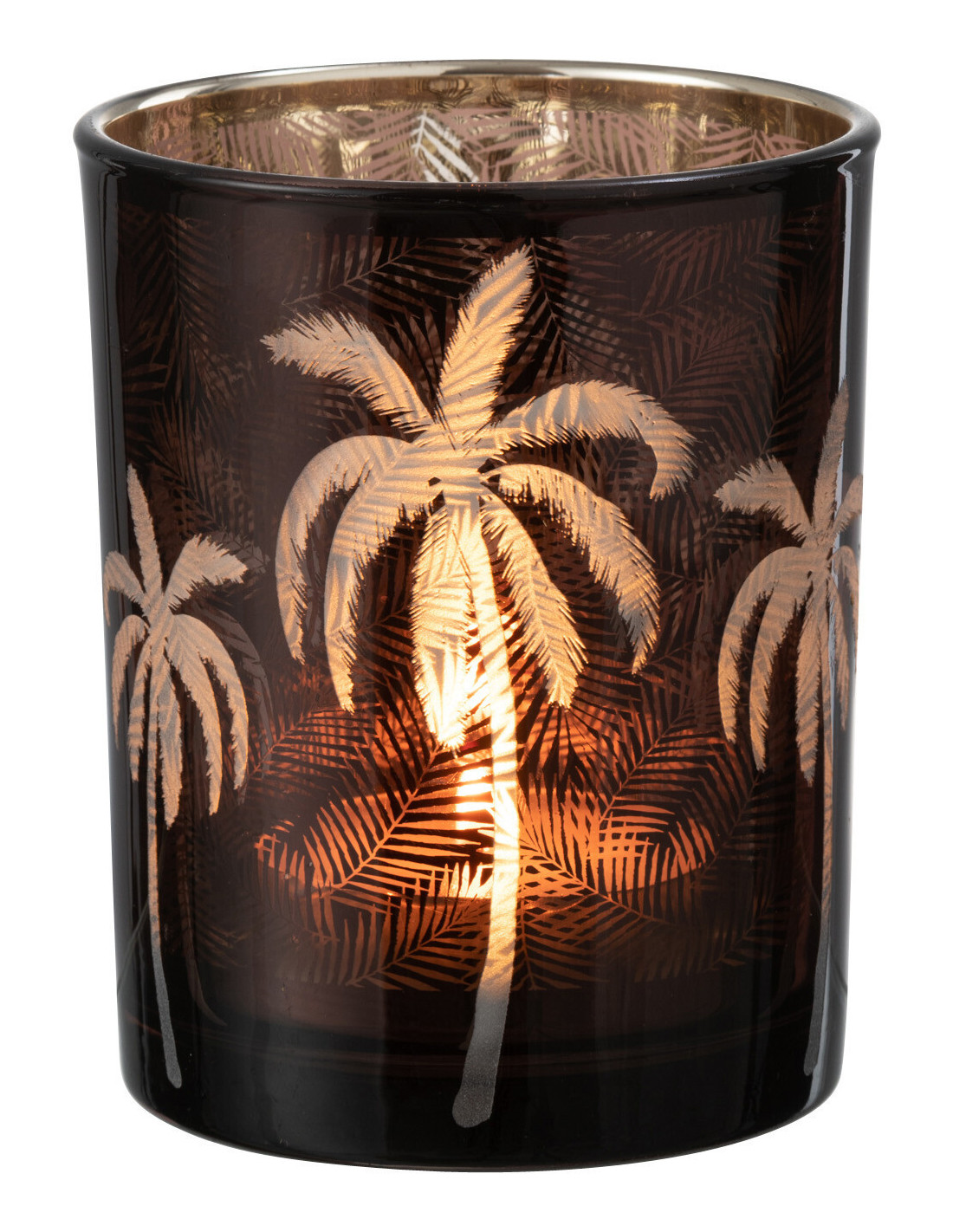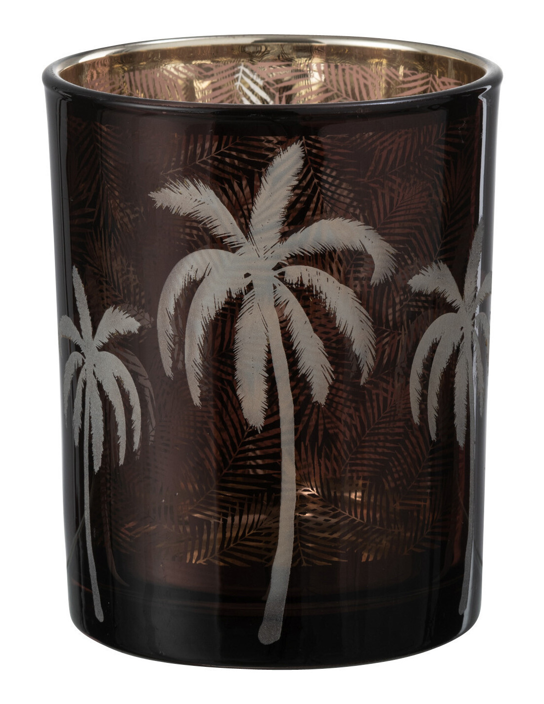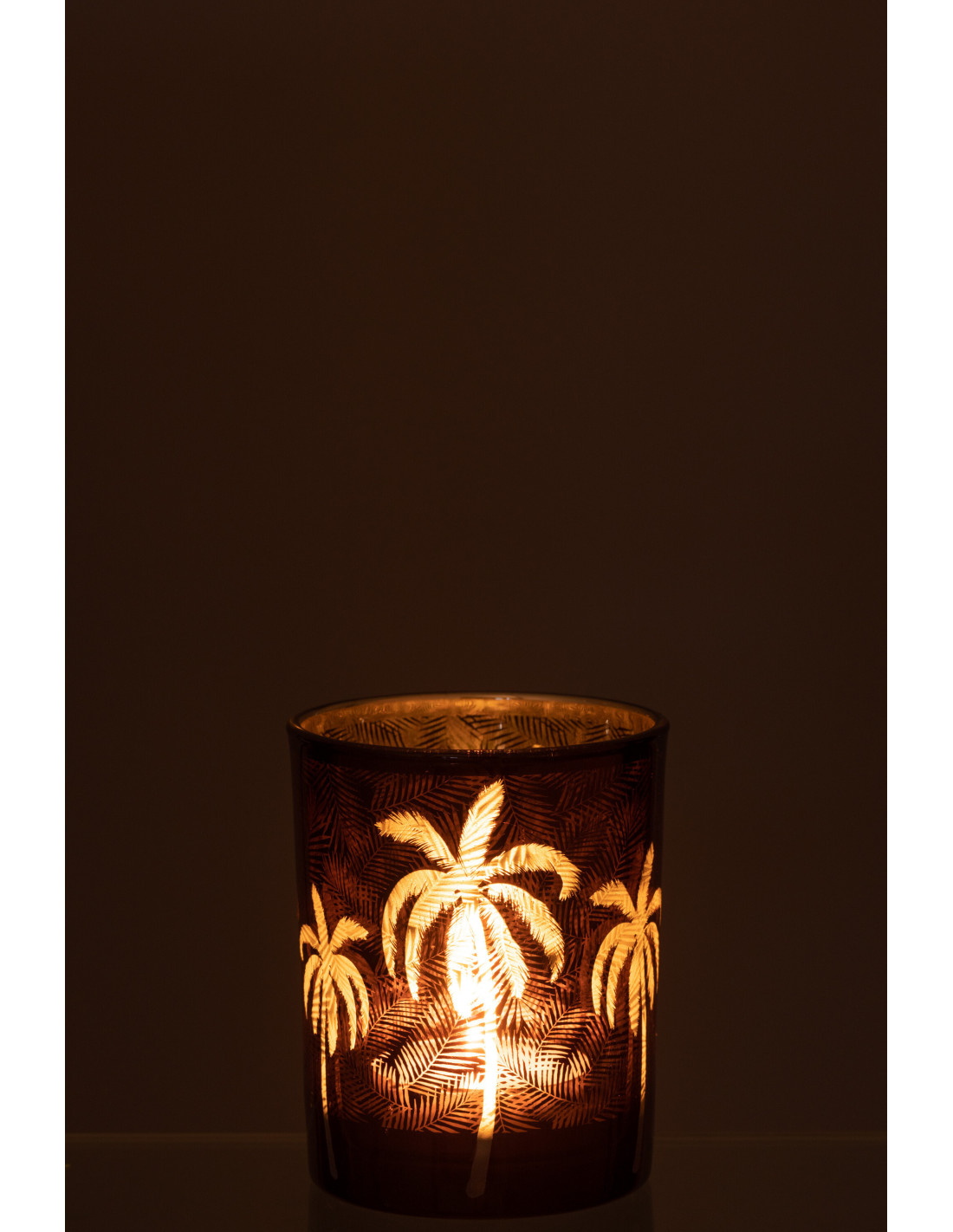 Photophore moderne exotique Diamètre 10 cm en Verre Marron Motif palmier Xotika