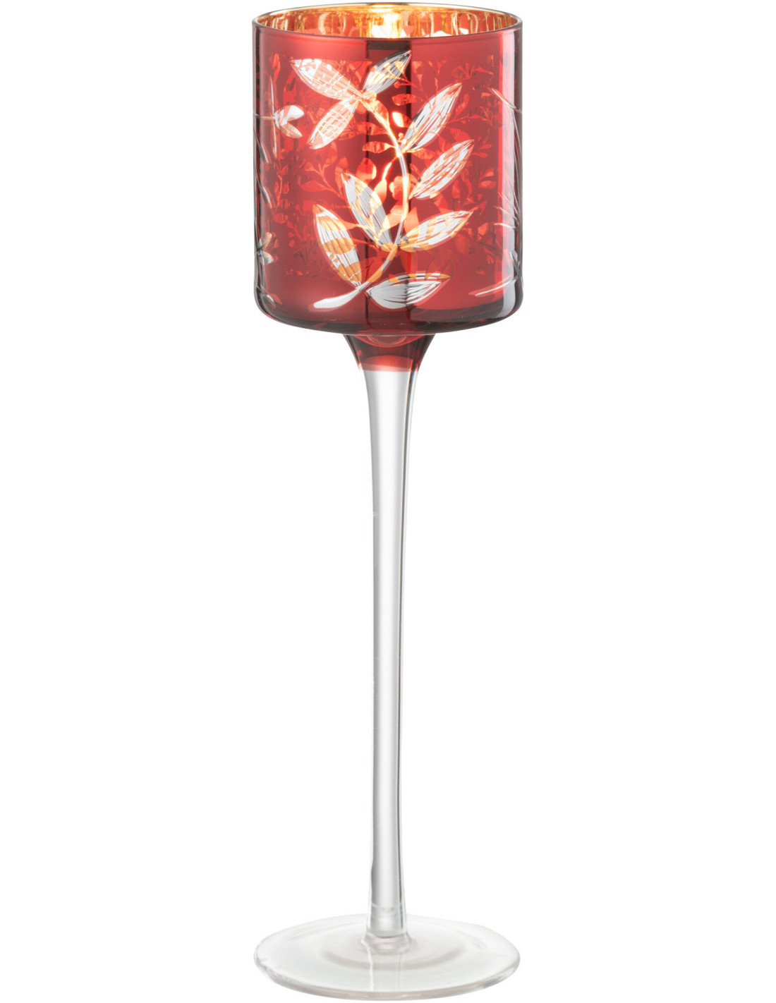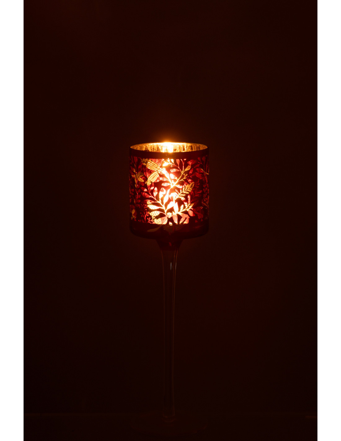 Photophore moderne sur pied Hauteur 25 cm en Verre Rouge Motif feuilles Covin